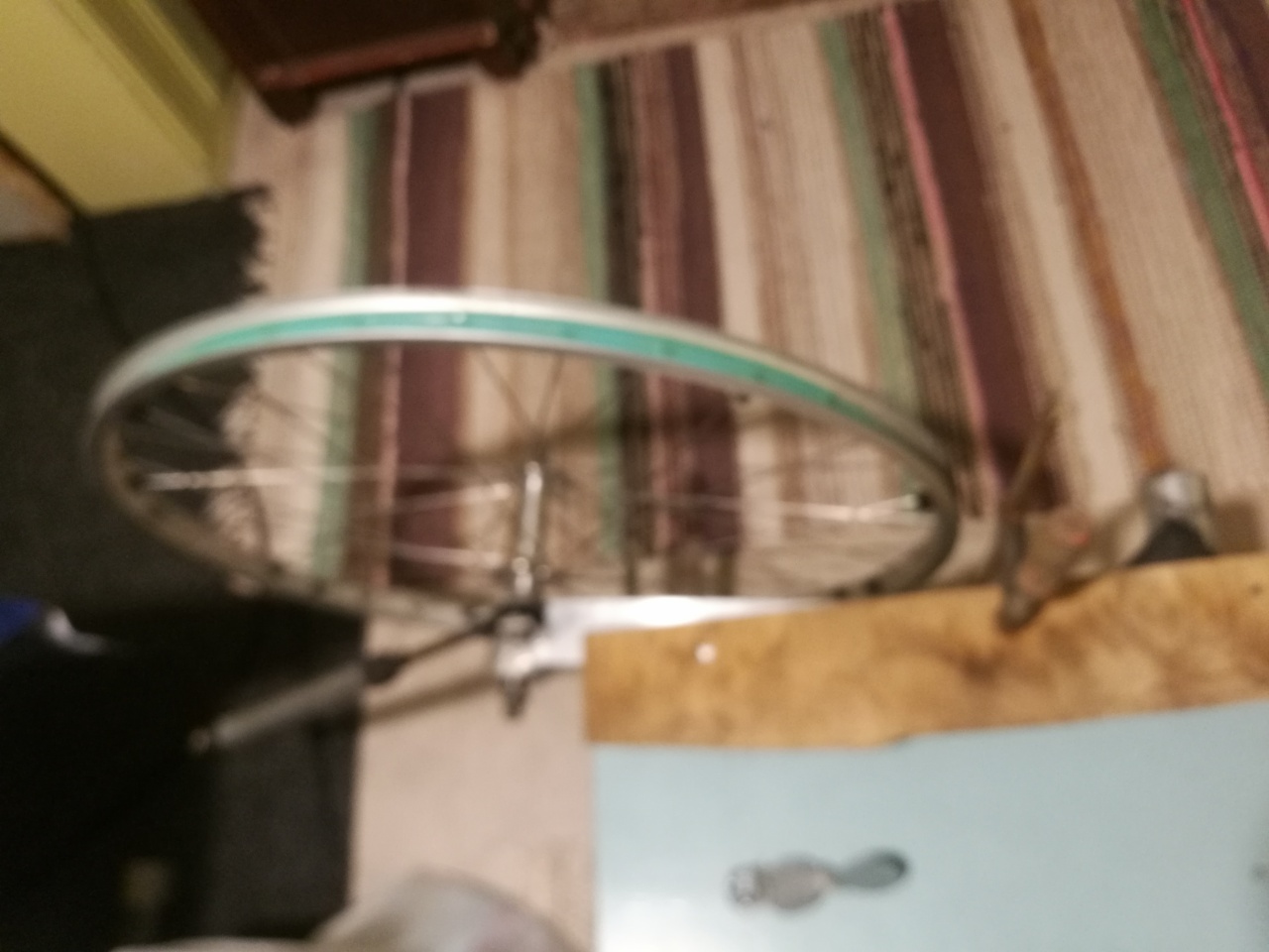 Otinpa vielä tukivarren irti ja puristin sen tuoliin kiinni - kiekko akselille josko tuossa vois pinnoja kiristellä ja vannetta oikoa, ei se ihan täydellinen ole.