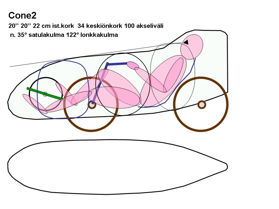 Cone 2 etenee virtuaalimaailmassa, piirsin mielestäni kivemmat linjat kopalle, se nyt sitten näytää varnalta :lol: ajoasento on tällä kertaa varmasti toimiva lowracerimainen. päädyin 20" kiekkoihin kun kopan sai siten pienemmäksi... koppa on 50 cm leveä, 86 korkea ja 200 pitkä. poljinten kohdalta hieman neliömäinen pokkileikkaus, muuten ovaalimainen. Plugi olisi tarkoitus valmistaa finnfoamista, ei muuta kuin kuumalangalla leikkelemaan.