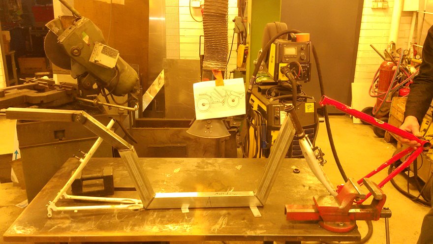 Luovuttajapyörän emäputki oli hitsauskelvottoman ohutta, joten tehtiin uusi 38x2-putkesta.