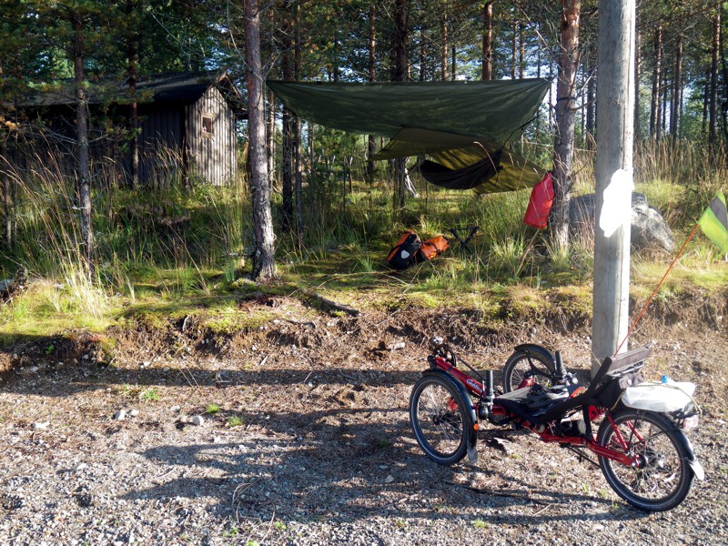 Ensimmäiset yöt riiputtu. Laitoin maton niin, että siihen on mukava istahtaa. Sen vuoksi lisäkatos kevytpeitteestä, sen alla pystyi pukemaan ym. suorana seisten. Kun tarppi on maton kiinnityksissä, sen alla piti istua jakkaralla kamoja välpätessä.