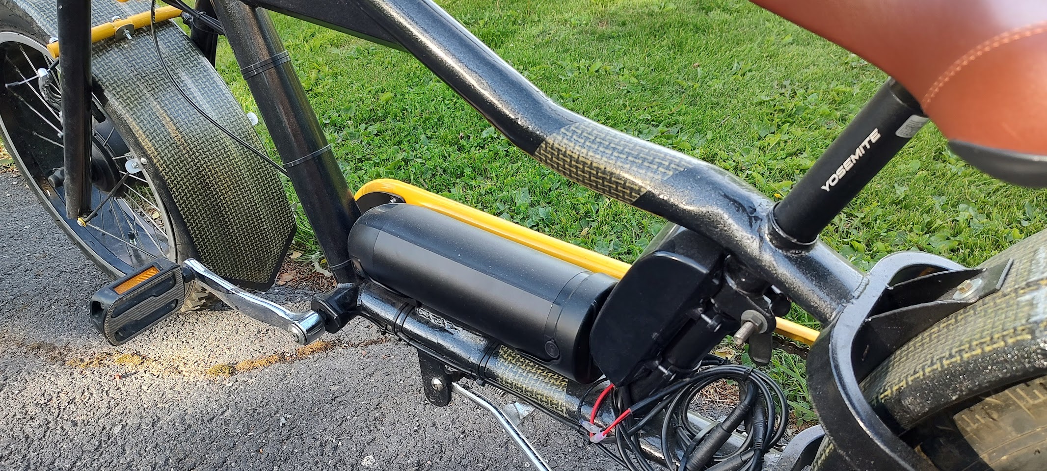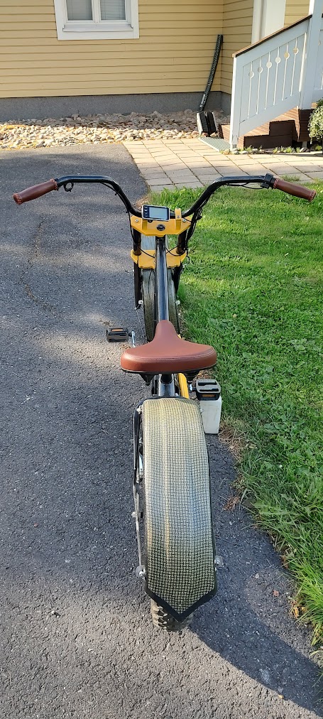 Sähköistetty, venytetty, levitetty ja kaikin puolin muutenkin modattu Schwinnin Stingray. Runkoa jatkettu n. 10 cm pidemmäksi, etuhaarukkaa levitetty 4" läskirengasta varten ja pyörään on asennettu 250 W /36 V / 10 Ah katulaillinen sähkösarja. Levitykset tehty työkaluterästä käyttäen ja päälle on vedetty hiilikuitu/kevlarpinta. Ajettu reilut 200 km valmistumisen jälkeen, ajoasento on vähän liian pysty mun alaselän välilevyille ja päivittäiselle 30 km työmatkalle. Sopii n. 155-185 -senttisille. Tule koeajamaan Oulun Maikkulaan.