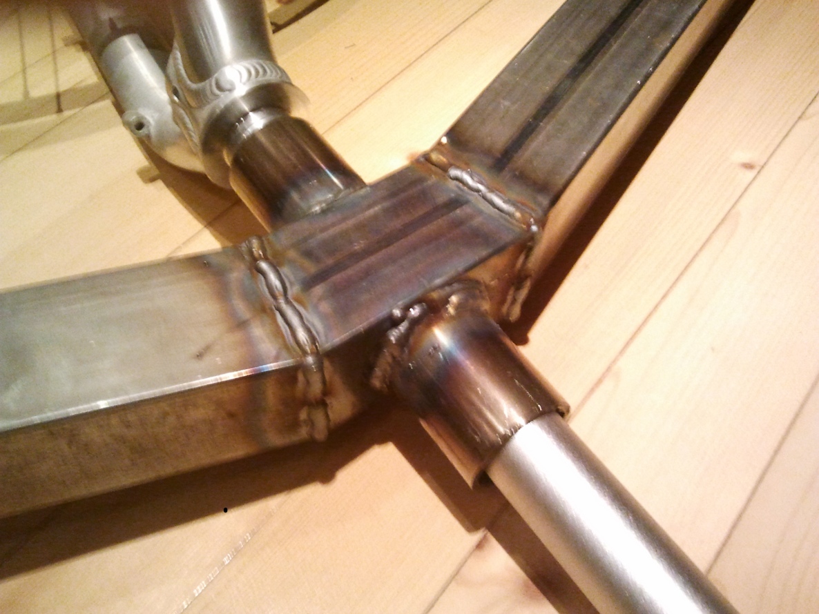 Homma edistyi tänään mukavasti. Sain takahaarukan puoliskot heppailtua kasaan, tehtyä takaripustuksen laakeripesän (ei kuvaa) ja hitsattua rungon kasaan.