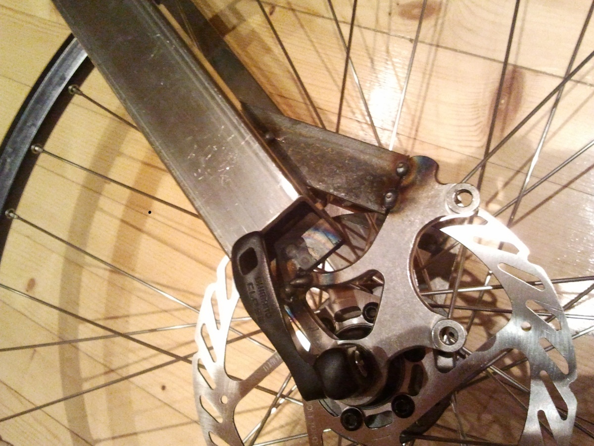 Tässä kuva levyjarrun puoleisesta takadropoutista. Se in hitsattu haarukkaputken kylkeen ja tein 3mm:n latasta tuollaisen lisätuen millä sain sen vietyä kiinni putkeen toisestakin kohdasta. Luulisi kestävän.