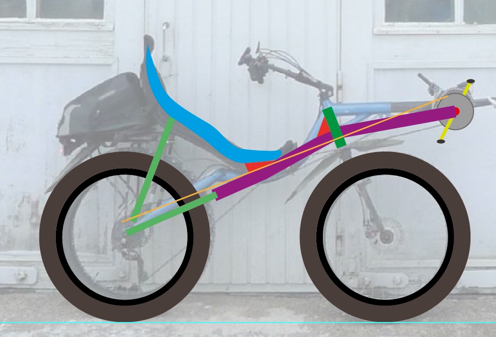 Olen tuota Wackyn kampipuomivauriota miettinyt ja päätynyt siihen työolettamaan, että ketjun suuri kulma puomiin nähden on merkittävä tekijä rungon kuormituksen nousemiseen väsymisvaurioittavalle tasolle. Tällainen muotoilus välttäisi tuon, vaikkei niin olekaan QD-perheen näköinen. Ehdottomasti laittaisin taittpyörän penkin taakse ja suurentaisin, jotta ketjun ja puomin kulma pienenisi ja vähenisi se, videoillakin kuuluva, ketjun sirinä taittopyörää vasten.Tuommosta runkolinjausta aattelin kans. Ehkä vois pari senttiä tiputtaa vielä haarukan kohdalta.