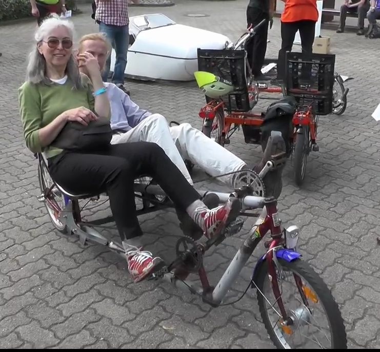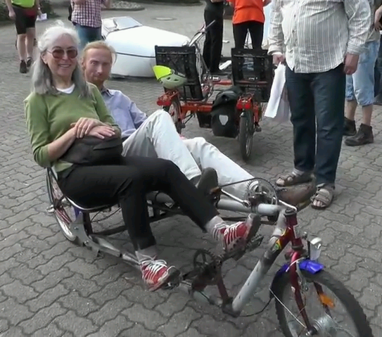 Tuossa videossa, kohdassa 5.45 tandemversio, vähän saman sukusesta pyörästä. Ykspuoleisella vedolla, ja yksi kampi lisää oikealla - ni Syrjiksestäkin sais helpost tandemin. muok. videon pyörässä olikin erilliset kammet.