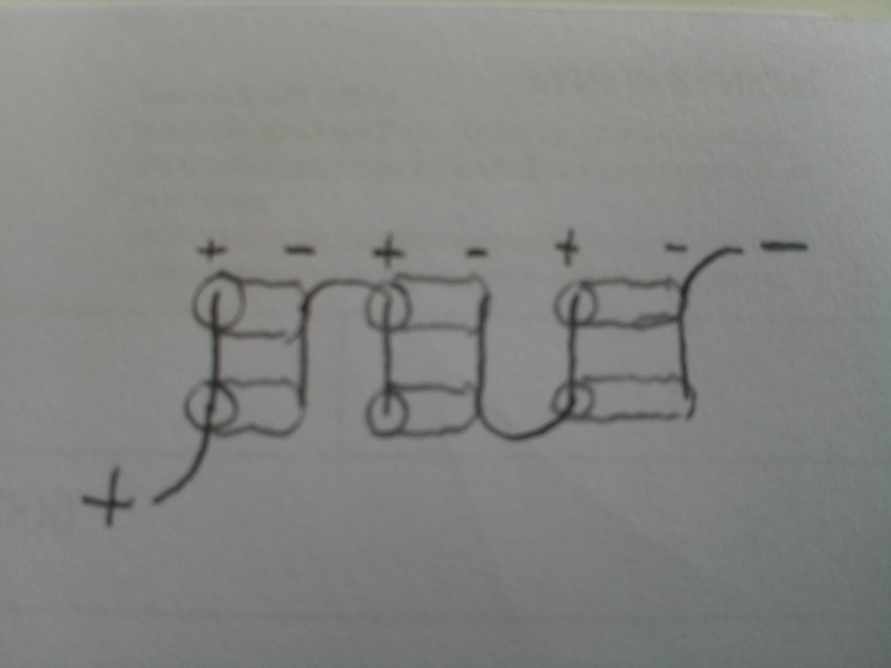 Tässä kuva mitä ajoin takaa. Tällaisella kytkennällä kuulemma varmistetaan että virta kulkee kaikkien kennojen läpi, ja rinnan kytkennässä heikoimmat kennot ei joudu niin kovalle rasitukselle.