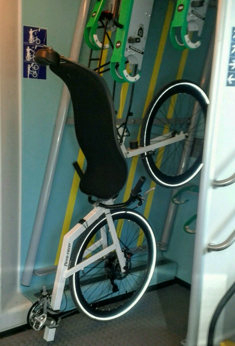 Toinen flevo kulki näin junassa, hieman kuvan ohjeita soveltaen. Kärsijänä takaheijastin, paluumatkalla laitoin lisäksi narulla telineen kiinni kun ei muuten pysynyt...