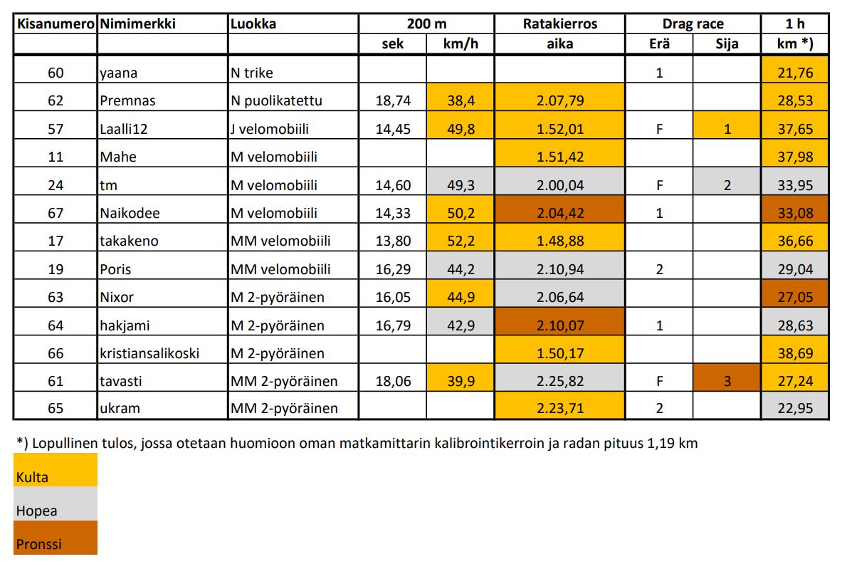 Lajeina 50m drag race, nopein ratakierros, 1h ajo ja 200m keskinopeus vapaalla alkukiihdytyksellä. Tulokset tulee julki kunhan ne saadaan sähköiseen muotoon, ovat vain paperilla vielä toistaiseksi.