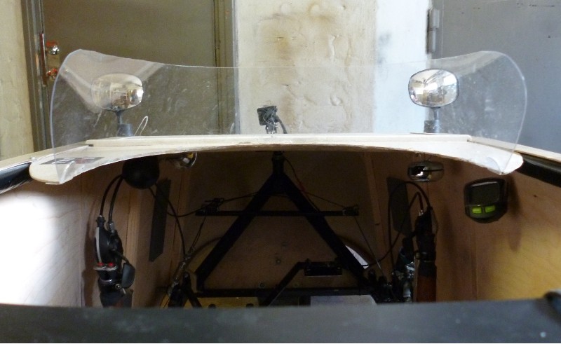 Polcarbonaatin optiset ominaisuudet ovat aivan toista luokkaa. Ohessa kuva 1,5 mm PC levystä taivutettuna ja velomobiilini mukaiseen kulmaan kallistettuna.