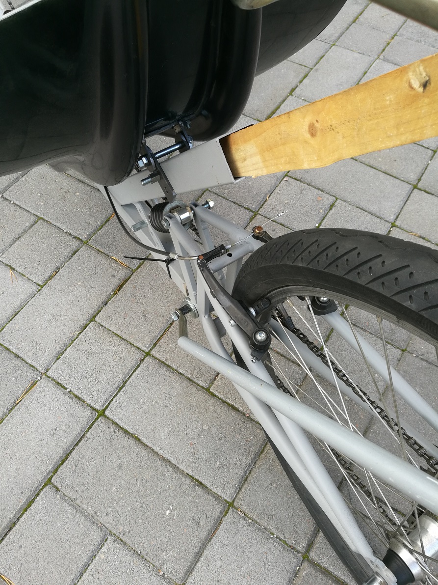 Kävin hetken hääräämässä triken ympärillä. Vaihdoin takavaihtajan vaijerinkuoren pidempään, edeltävä kun oli kahdesta palasta. Ohjaustankoa liikutellessa tuli mieleen muutama asia, ohjausnivelten välys, ackerman-kulmat ja ketjun suojaputki.