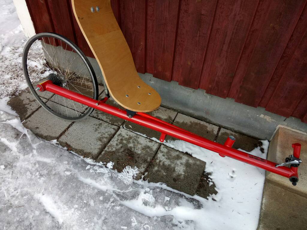 Pidemmälle kuskille niitä pitäisi pidentää jos penkin paikka pysyy samana. Taaksepäin en lähtisi tuolla nojatuella enää yhtään penkkiä viemään, eli paremmin tästä voisi mua lyhemmälle(184) pyörää värkkäillä. Lyhempää kampea ja penkille kiinnikkeet joilla se tulee edemmäs...