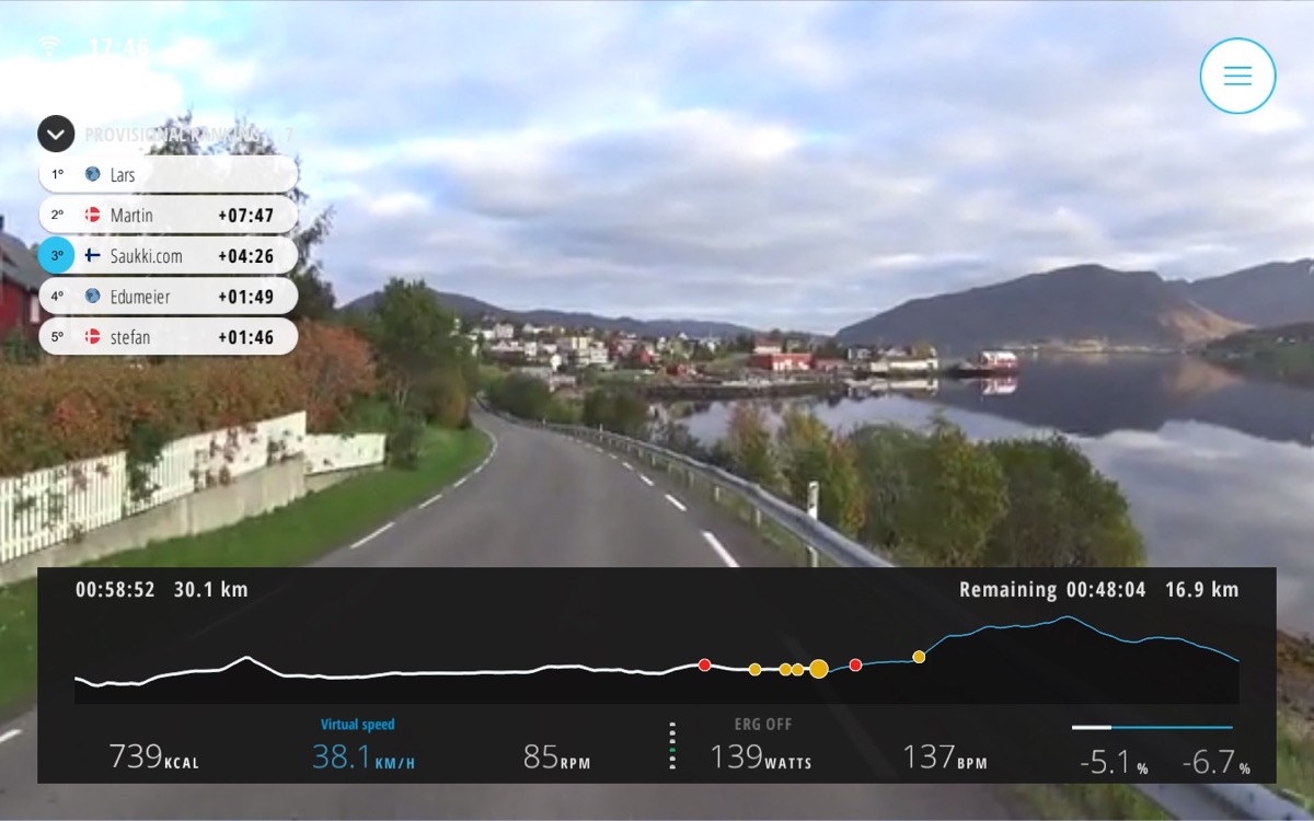 Zwift laskee myös tehon erilailla. Tuntui, että se näyttää kokoajan suurempia lukemia, kuin Bkool. Esimerkiksi Bkoolissa mun FTP lukema oli jotain 245 W, kun taas yhden session jälkeen Swift ilmoitti laskeneensa mulle FTP lukemaksi 279 W. Tähän varmaankin vaikuttaa se, että Swiftissä alamäkeen ajaessa saa paljon helpommin pidettyä tehoja yllä, kuin taas Bkoolissa alamäessä vastus häviää lähes kokonaan, joten korkeaa tehoa on lähes mahdoton pitää yllä. Varmasti vaikuttaa myös Bkoolin kanttiset maaston muodot. Kun nousu muuttuu yhtäkkiä alamäeksi, tippuu tuotettu teho myös yhtä nopeasti. Swiftissä voi pitää tehoa koko ajan yllä, kun maastonmuodot (ja sitä myötän vastus) muuttuu paljon luonnollisemmin.