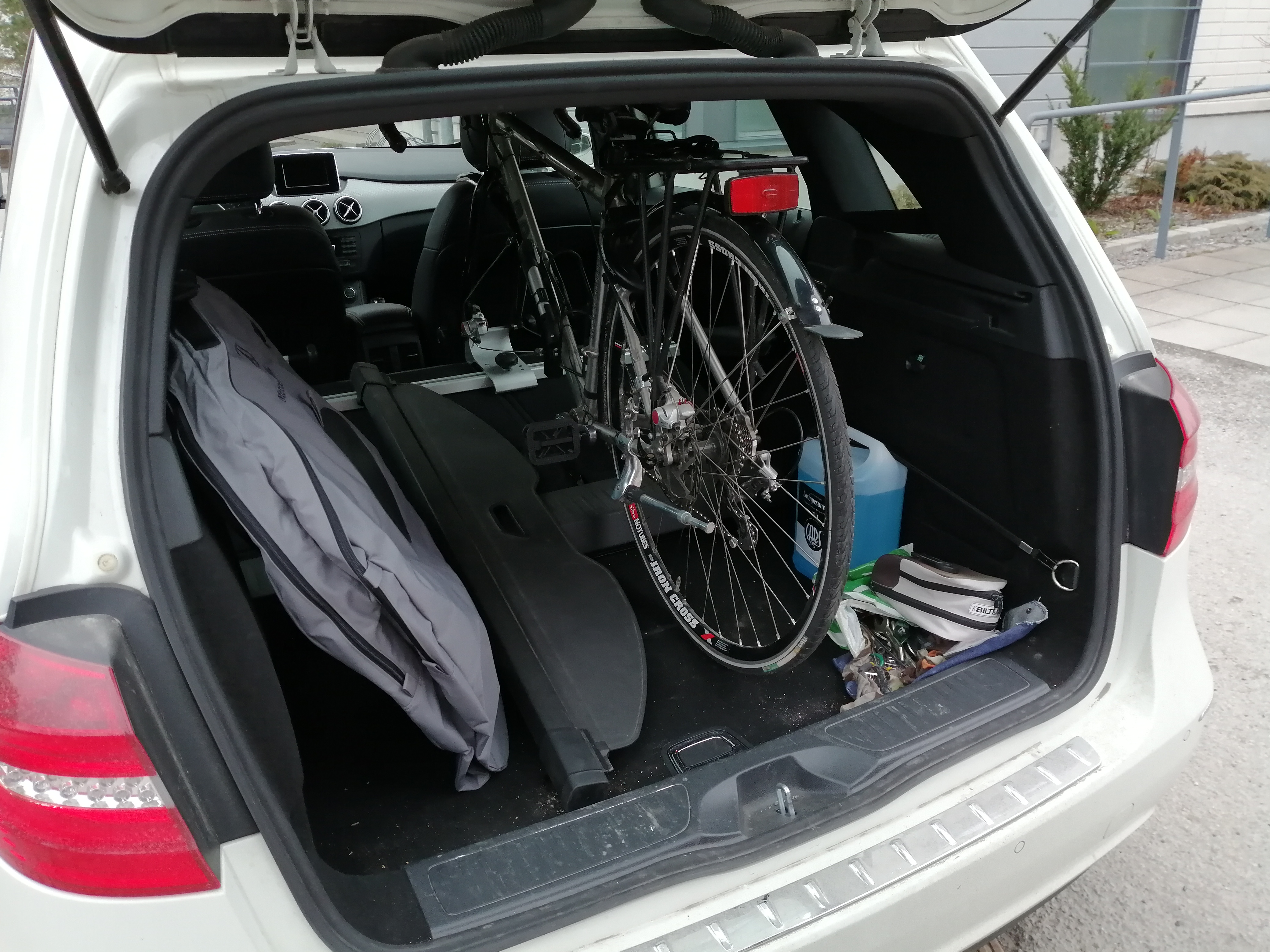 Auto on B-malli Mersu, W246, pyöräteline on malliin W245, mutta sopii tähänkin malliin. Satula pitää laskea alas ja etupyörä irti - telineen mukana tulee pussi etupyöriä varten - toisessa kuvassa vasemmalla.