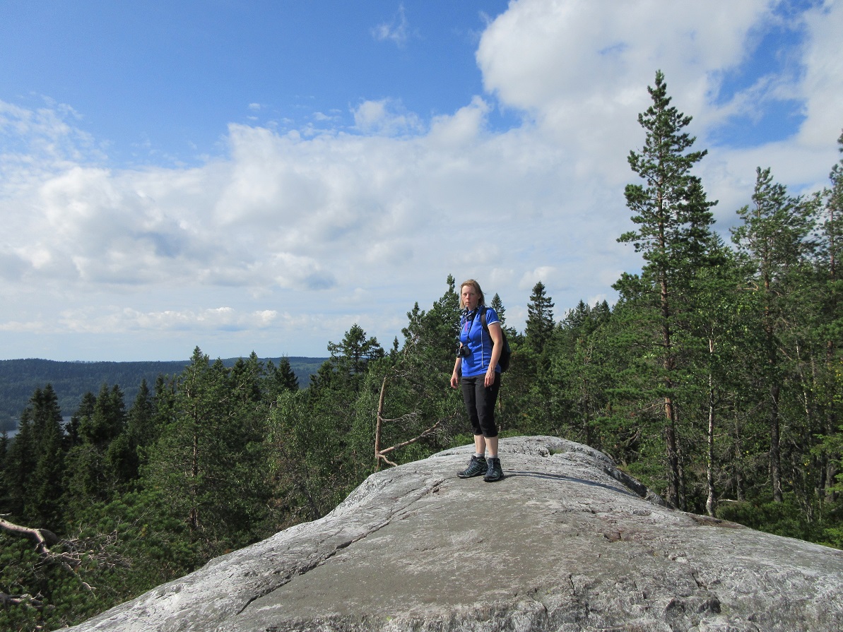 Huiput oli edelleen hienoilla näköaloilla varustettu, polut kivikkoisempia, vähänkuin sellaisia ”oikeita” polkuja. Vaaleita teräviä/kulmikkaita kiviä olisin halunnut ottaa Mangollisen kotiin viemisinä mutta kartta lupasi edelleen ylämäkiä ja retkitavaratkin pitäisi saada kulkemaan niin sinne jäi. Saila tykkäsi istuinpuusta. Huipulla söimme ensimmäisen erän eväitä. Kukkuloilta laskeuduttaessa oli mukavan vehreä laakso ja kaunis kukkaniitty.
