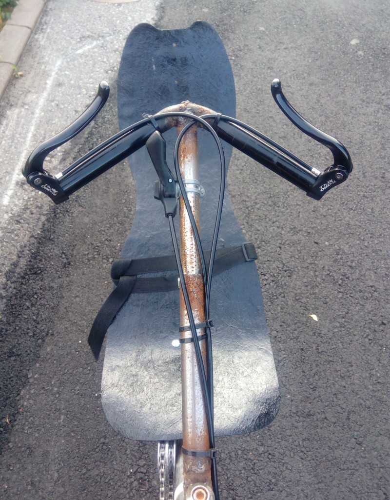 Tuosta ohjaustangosta olisi kiva nähdä myös kuvaa... näyttäisi siltä että jarrukahvat on takaperin ja sarvet osoittaisi taaksepäin.