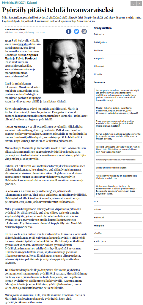 "Pyöräily kaupungissa pitäisi saada luvan varaiseksi, jotta italialaiset voisivat rikkoa suomessa sääntöjä."