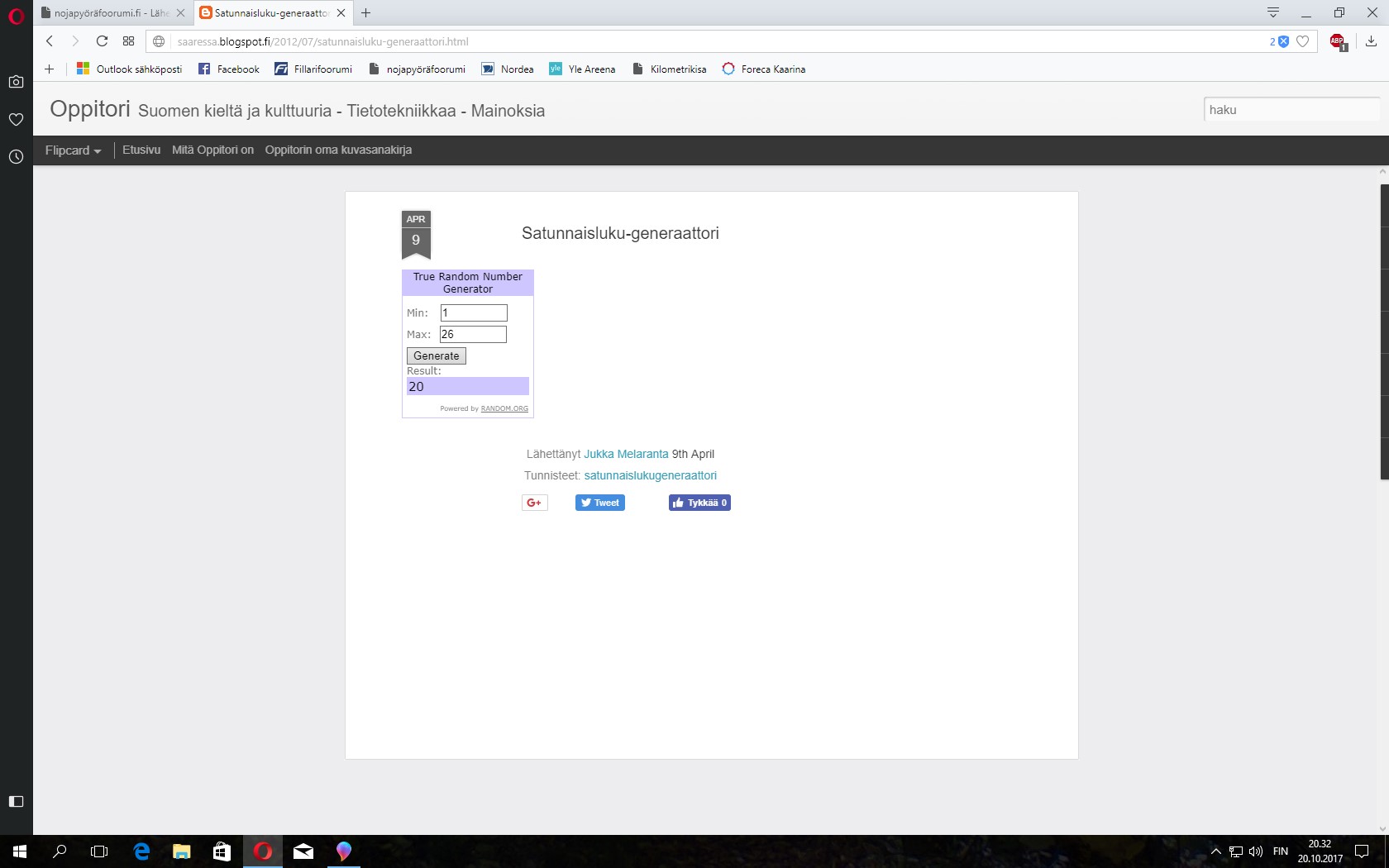No niinpä tietenkin. Kokeilin tuota ja sain numeroksi 20. Mut onko toi Joosehan nyt sit virallinen arvontatulos ku ehti ekana vai se minkä ite suoritin?