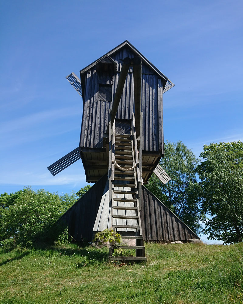 Cafe Wäfvars löytyi rinnetontilta kylän keskeltä. Monitasoiselta terassilta oli hyvät näköalat merelle. Kuva on alimmalta tasolta, ylempää näkyi paremmin. Kahvilan takana oli Härkäpään tuulimylly. Kana-kookoskeitto, Malmgårdin olut ja jäätelö maistuivat tässä rauhassa. Asiakkaita oli mukavasti ja toivon, että näin ihana paikka menestyy.