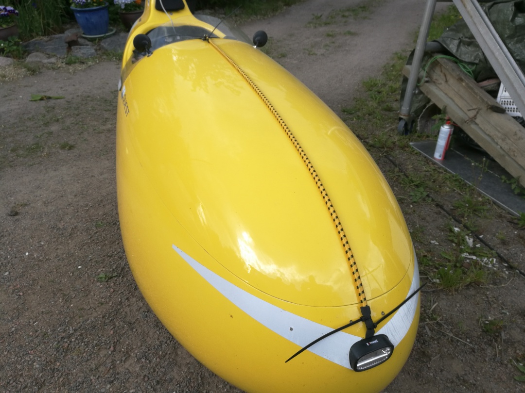 Vahingossa tuli kumiköysiviritykselle muutakin käyttöö, ohjaustangon saa pysymään kannen alla ja kannelle voi laittaa esim tuon kaulurin - pysyy tuulessakin köyden alla kun nousee pyörästä.
