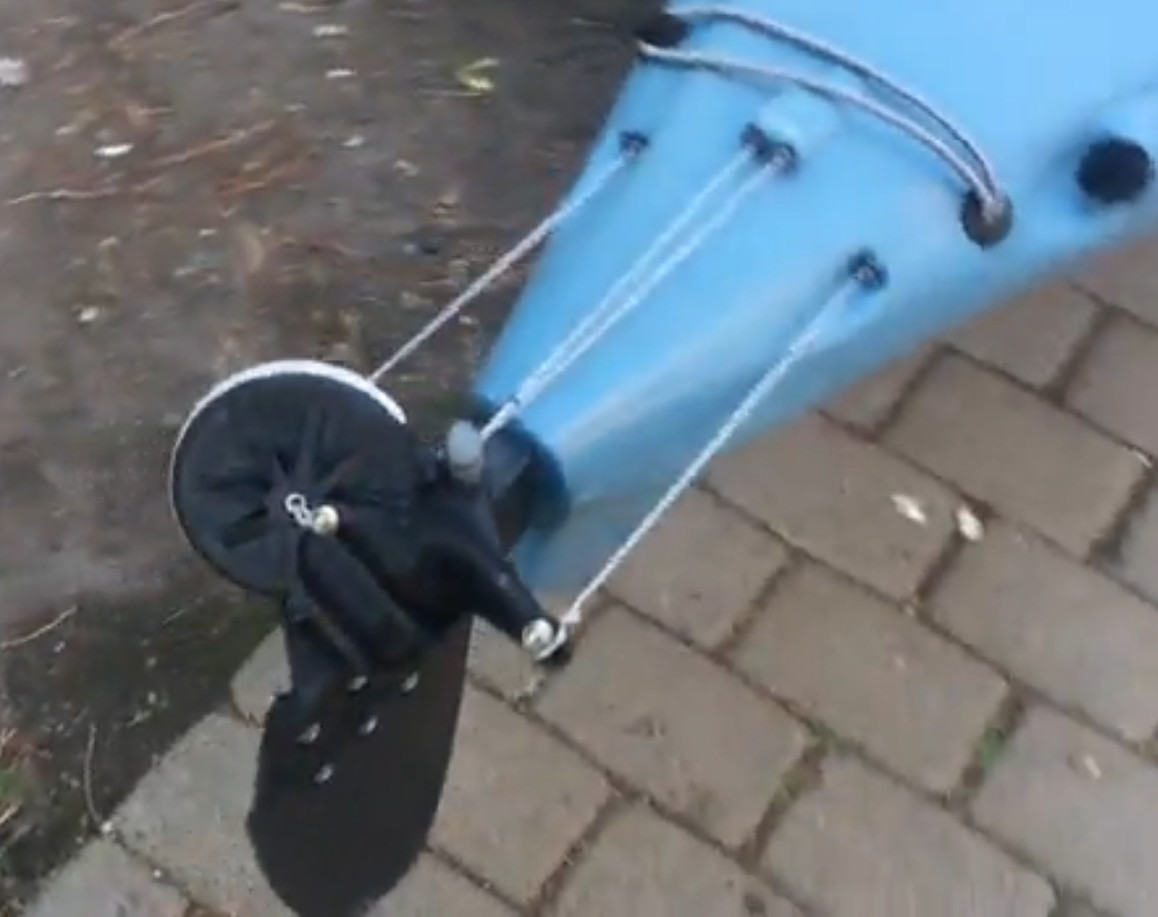 Minua näissä Hobie tuotteissa ihastuttaa huolellinen suunnittelu. Tuo peräsimen ylös taittavan nivelen asettaminen vinoon on nerokas idea. Peräsin väistää nousee nätisti ylös, jos ajaa liian matalaan tai kivelle, mutta peräsin kääntyy nätisti lappeelleen kannen päälle haittaamasta varastointia ja kuljetusta. Peräsin siis kääntyy alhaalta yläpuolelle 270 astetta samalla kiertyen 90 astetta. Nerokkaan yksinkertainen. Yksi akseli, joka on sopivasti vinossa. :D