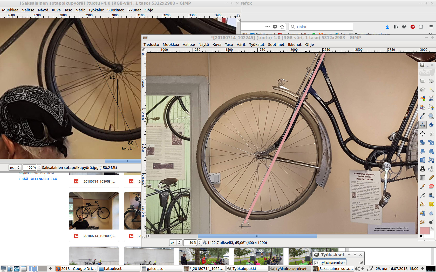Joosehan oma kommentti ketjun alussa: "Laitan ylös myös suunnitellun geometrian. Ohjauskulma 67, jättö -15, sylikulma 145, nojakulma 30, akseliväli 105, istuinkorkeus 55. Ei hajuakaan miten lähelle osuin."