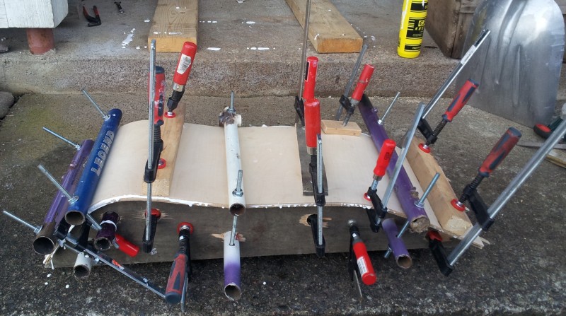 Vielä kun olisi listattu missä järjestyksessä tuo puristuksiin laitto pitää tehdä niin onnistuisi muillakin helpommin. Käsittääkseni se kannattaa tehdä niin että 4mm:n vanerit laitellaan yksi kerrallaan päällekkäin, ehkä hieroen niitä jotta liima leviää tasaisemmin väliin. Sitten paketti muotin päälle ja ensin keskeltä purkistuksiin ja sitten keskeltä päätyyn päin järjestyksessä puristimia kiristäen.