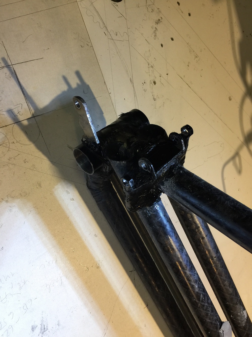 Takahaarukan tein 12 mm hiilikuituputkesta, niitä on kaksi päällekkäin alimmissa varsissa. Lokasuoja on kantavaa rakennetta, siinä on sandwitch levy sisällä. Rungon pääosa on neljästä putkesta ja se on mitoitettu niin että akut sopivat sisään. Bottom bracket on 100 mm ja ns lugged eli hitsailin siihen kiinni putkien kiinnityskorvakkeet ja moottorin kiinnityskorvakkeen.