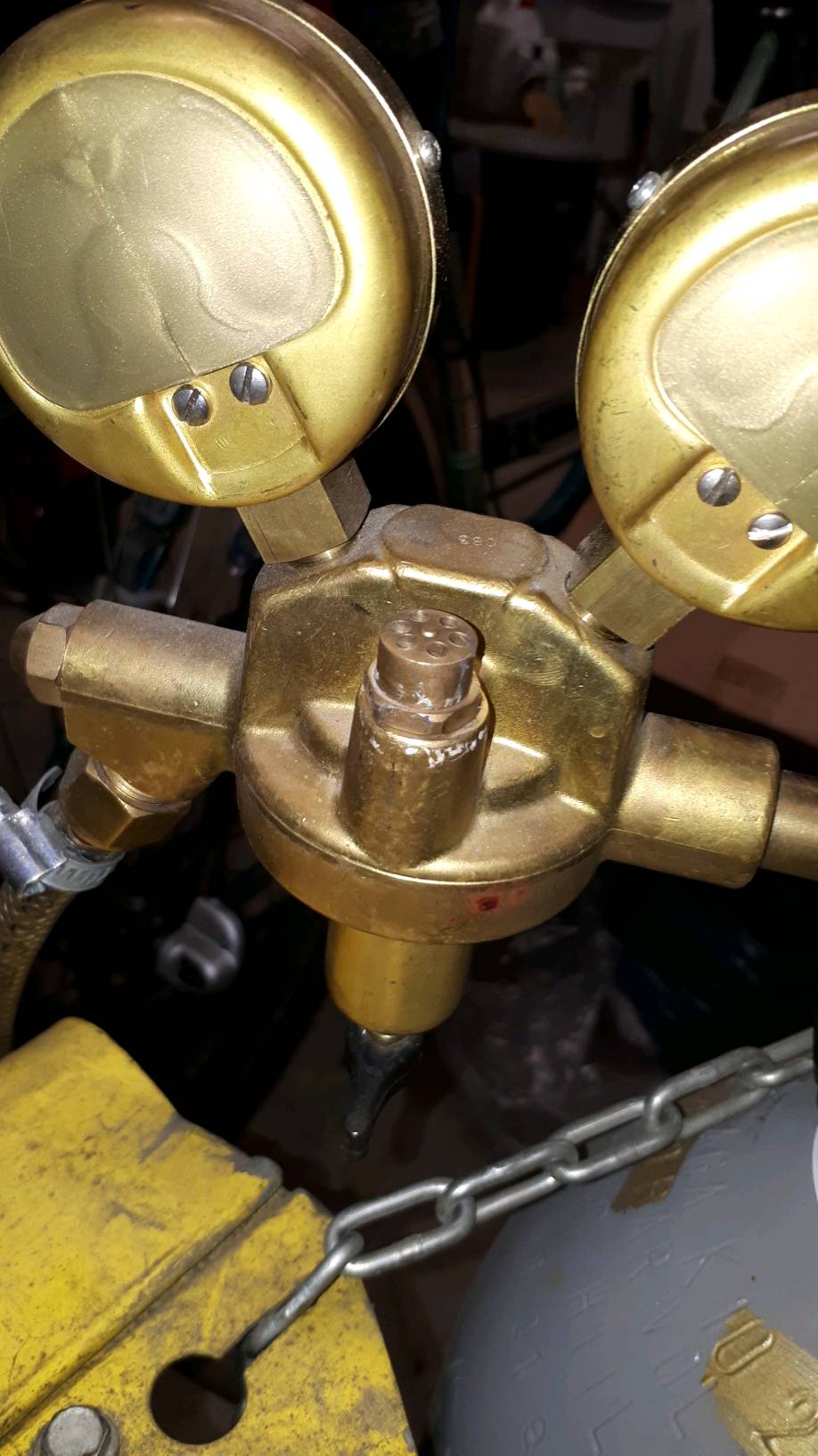 No niin. Turha märinä pois ja toimiin. Ilmeni että kuvan varoventtiili on säädettävä. Juuressa näkyy lukitusmutteri ja itse varoventtiiliä pyörittämällä säädetään jousivoima, millä venttiili sulkeutuu. Pyöritin sen sormivoimin pohjaan, eikä vuoda enään.