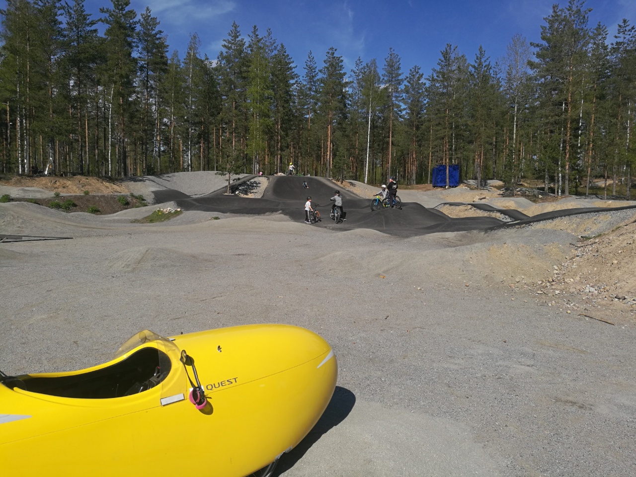 Karhumäen pumptrack, talkoilla pääasiassa tehneet radan - viime syksynä kaupunki kustans asfalttia osalle aluetta. Nytkin oli penskoja varmaan parikymmentä jos ei ylikin, vaikkei ollu mitkään viralliset harkat. Pitävät maastopyöräkoulua lapsille, vapaaehtoisvoimin.