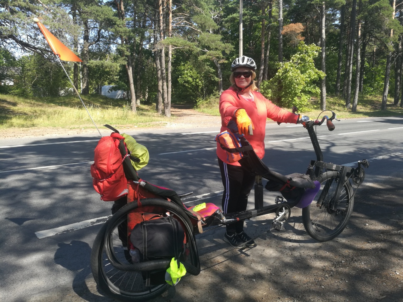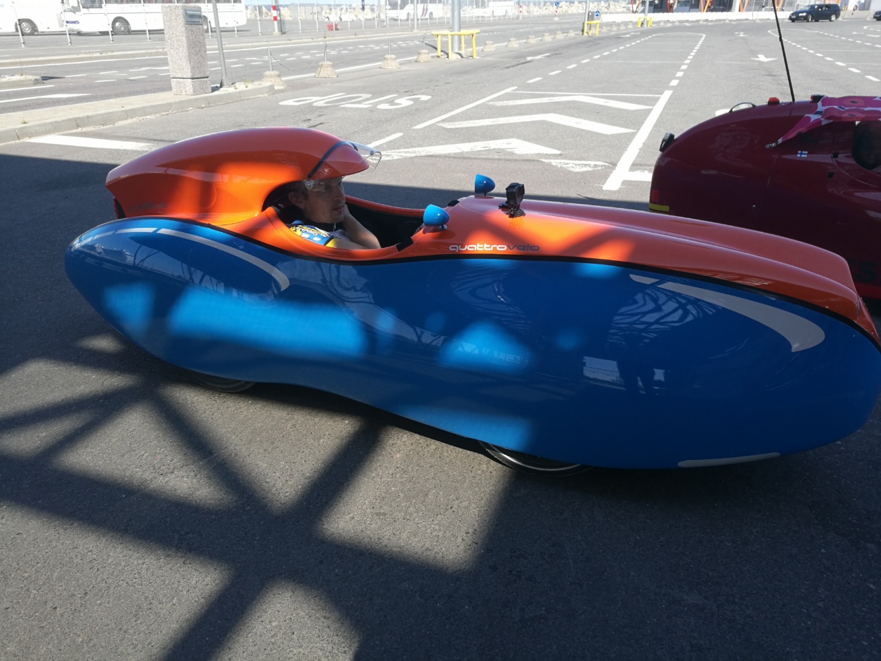 Sunnuntaina lähestymään Tallinnaa, reitti 35km - puoli kaupunkia kiertäen. Jossain kaupungin laidalla ajoin korkeakolta reunakiveltä alas ja ohjaustanko meni veteläksi. Ohjaustangon hitsaus oli revennyt toiselta puolen. Jori korjas sen pingottamalla liinan, jarrukahvan ja keskiön välille - jarrukahvaa kun kiersin, liina kiristyi ja pyörällä pystyi ajamaan.