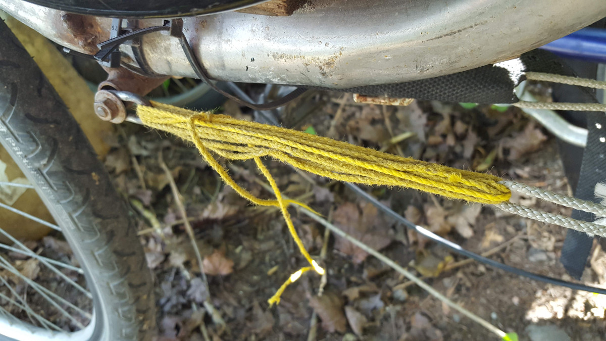 Korjauksen piti olla väliaikainen, kunnes saan ostettua narua. En saanut. Retki ehti loppua ennen kuin pääsin kauppaan, josta olisin saanut narua ja aurinkovoidetta, jonka olin unohtanut lainanneeni tyttärelleni.