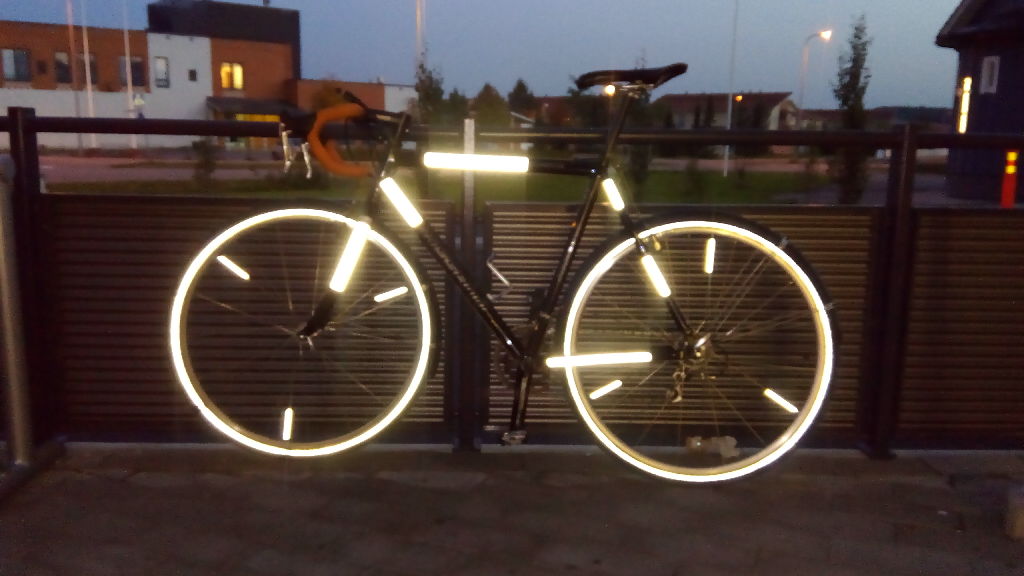 Otin siitä kuvan eilen illalla, kun oli hieman liimaillut sen kylkiin Motonetista ostamaani halpaa heijastinteippiä: