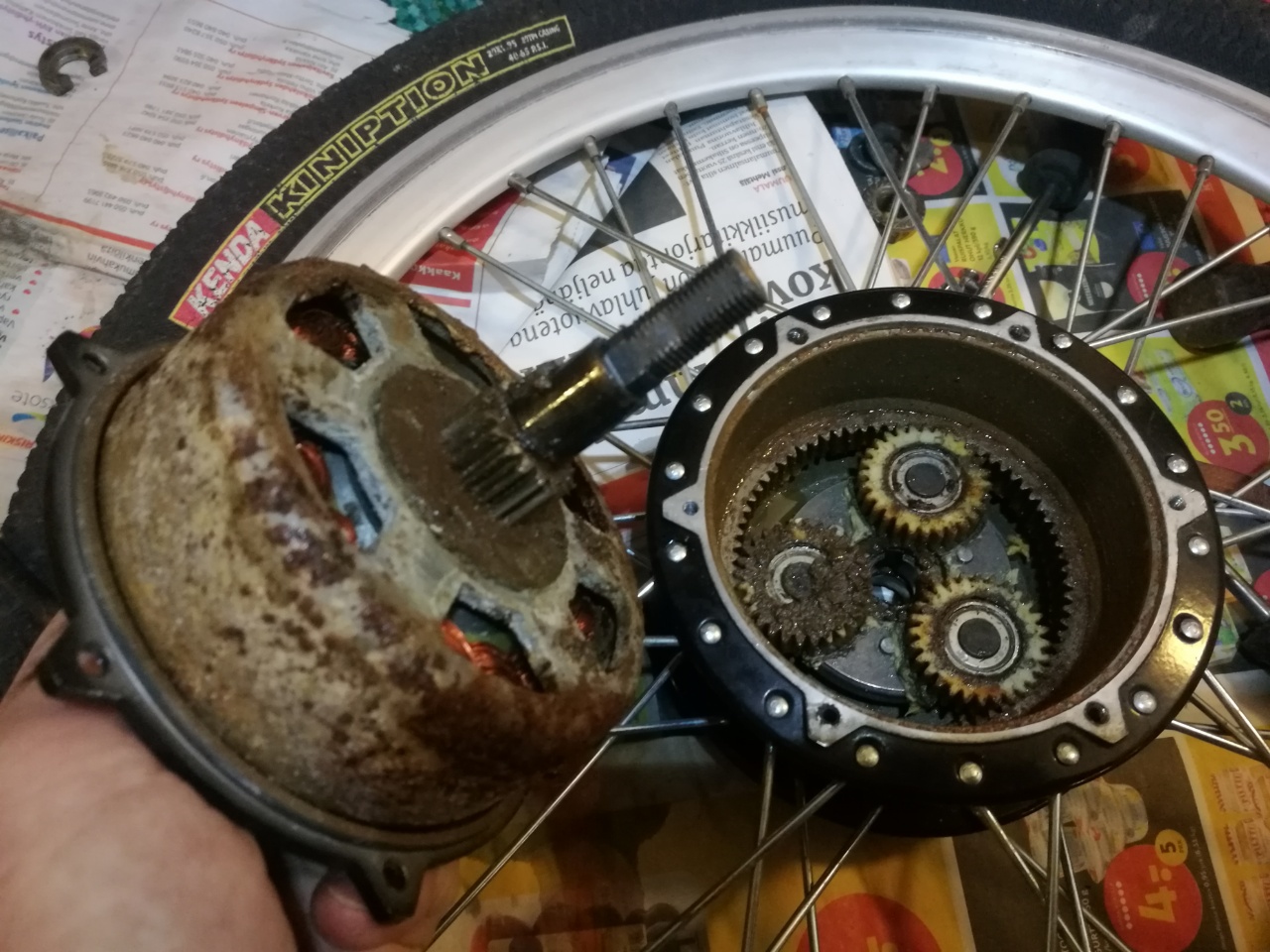 Näyttää siltä, että oli aikakin purkaa tuo. Vaihteiston rattaat kannattaa puhdistaa huolella ja rasvata puhtaalla rasvalla. Moottoria voi käyttää ilman tuota vaihteisto-osaa. Pane akselinpää ruuvipenkkiin kiinni ja kytke sähköihin. JOs saat sen pyörimään, on roottorin ulkopinnan puhdistaminen helpompaa pyörivää roottoria teräsharjalla tai hiomanauhalla jarruttamalla.