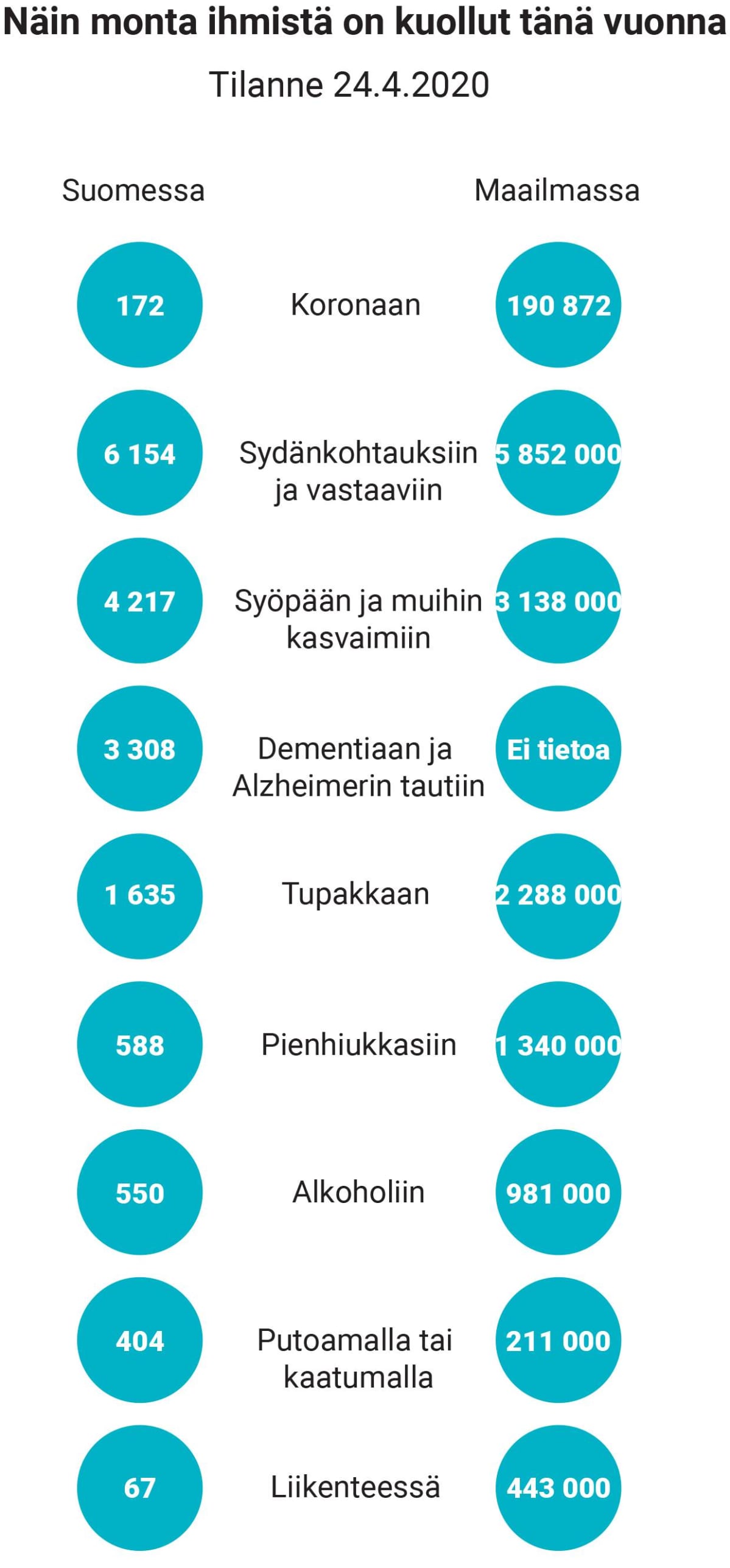 Kuva: Tuomo Björksten ja Eetu Pietarinen/Yle. Lähteet: Tilastokeskus, WHO, Johns Hopkinsin yliopisto, THL, Liikenneturva, Duodecim ja Nature-lehti. Koronakuolemat perustuvat laskelmassa todelliseen tautitilanteeseen. Muiden kuolemien osalta koko vuoden kokonaismäärä on jaettu viikkokohtaisiksi luvuiksi ja kerrottu sitten alkuvuoden viikkojen määrällä. Kyse on näin ollen suuntaa-antavasta arviosta. Suurin epävarmuus liittyy liikenteen kuolemantapauksiin, sillä autoilu on vähentynyt koronakriisin myötä.