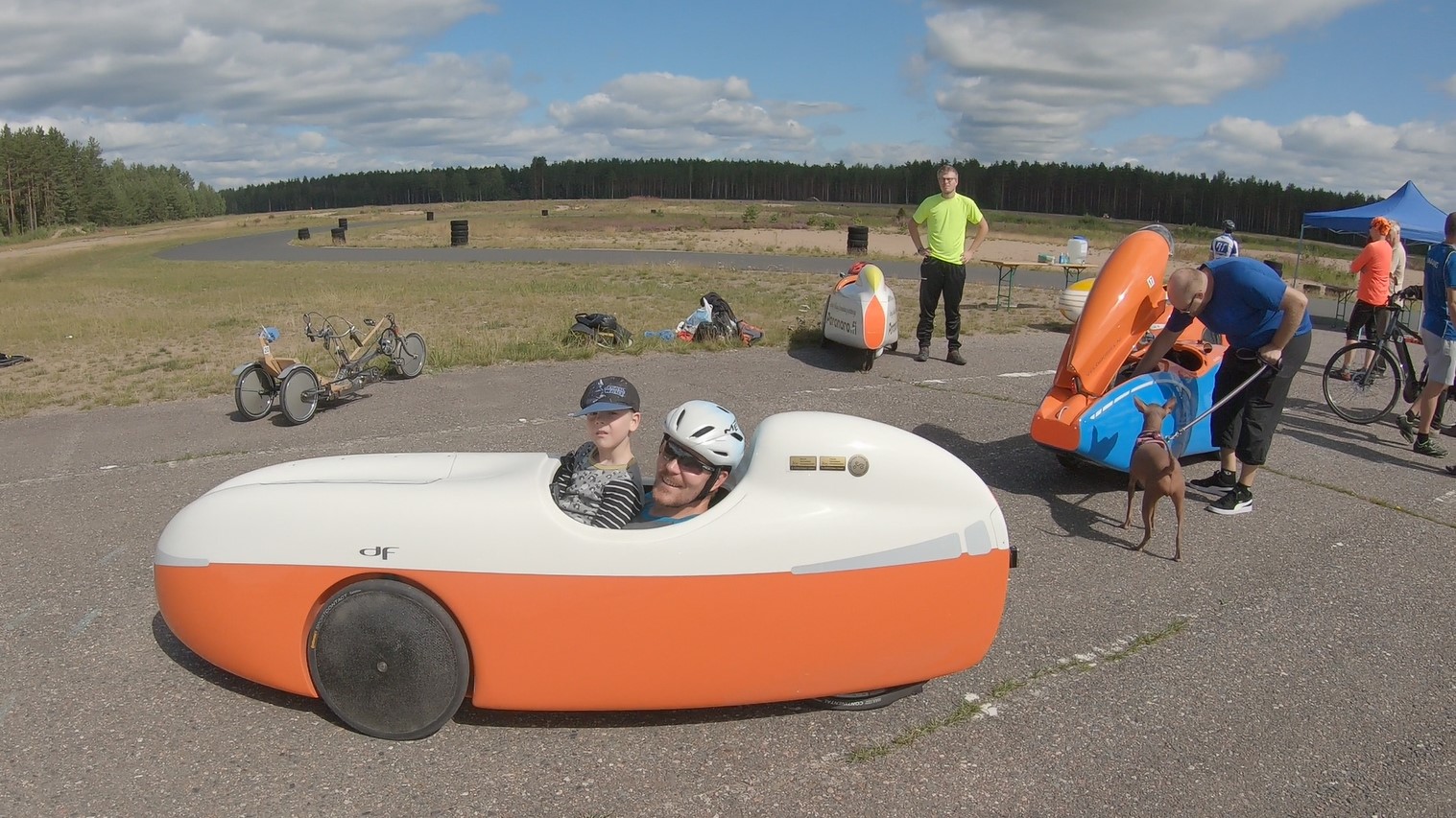 50m finaalin maaliviialta kuva. Velomobiili kiihty hyvin, kuin myös trike kevyellä kuskilla.