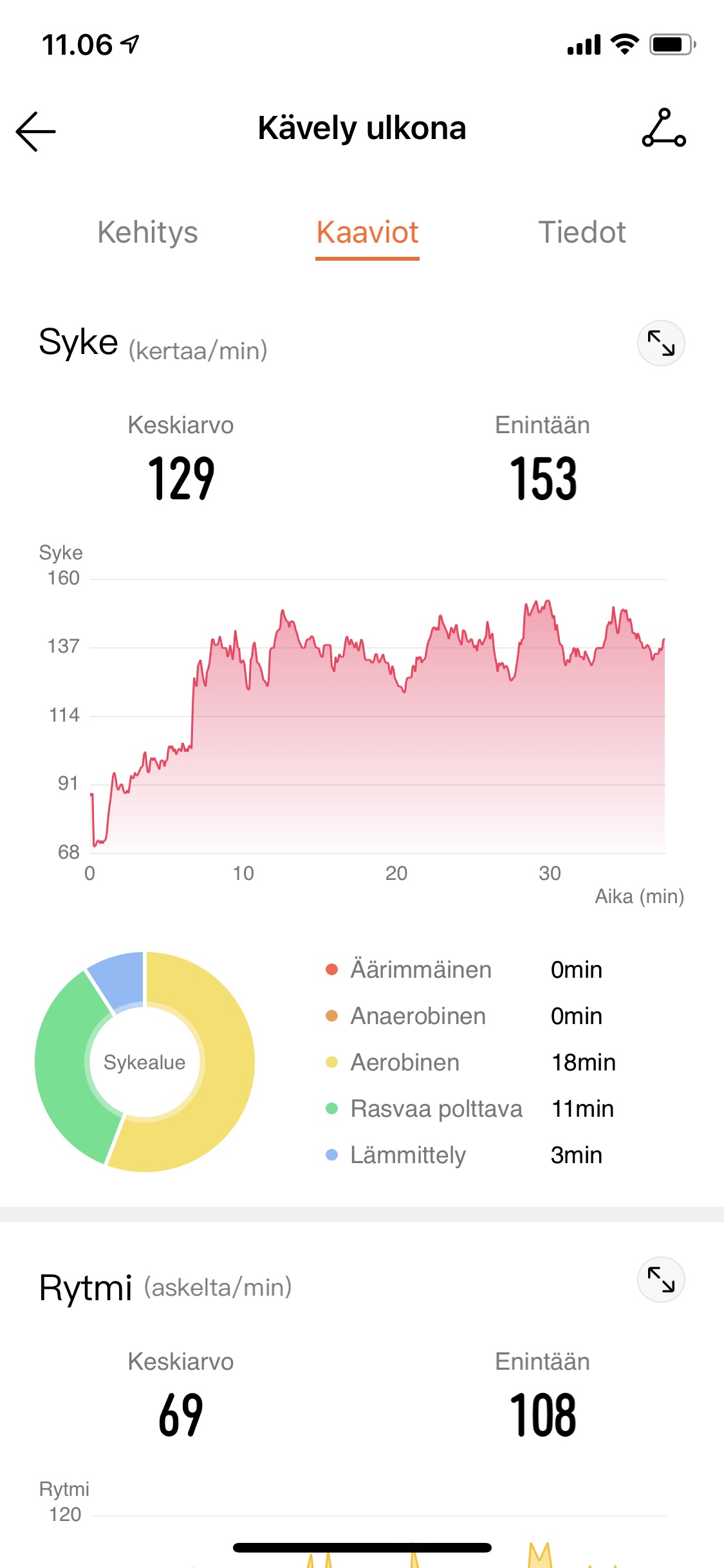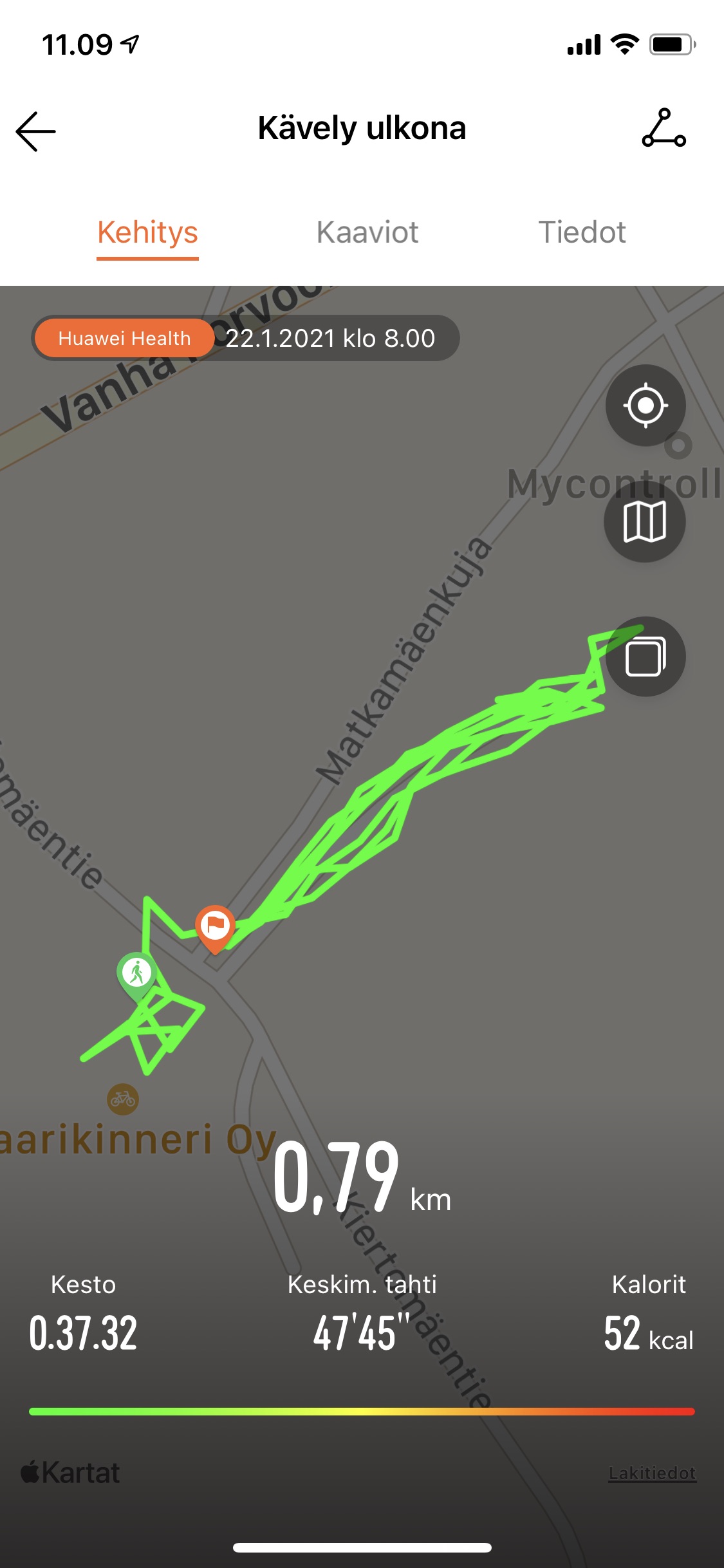 Mä sain mitattua ;-) Tein tossa samalla naapurinkin tien, kun seillä asuu 80v pariskunta. Toki koko homma lingolla, mutta silti sykkeet nousi ja hiki tuli.