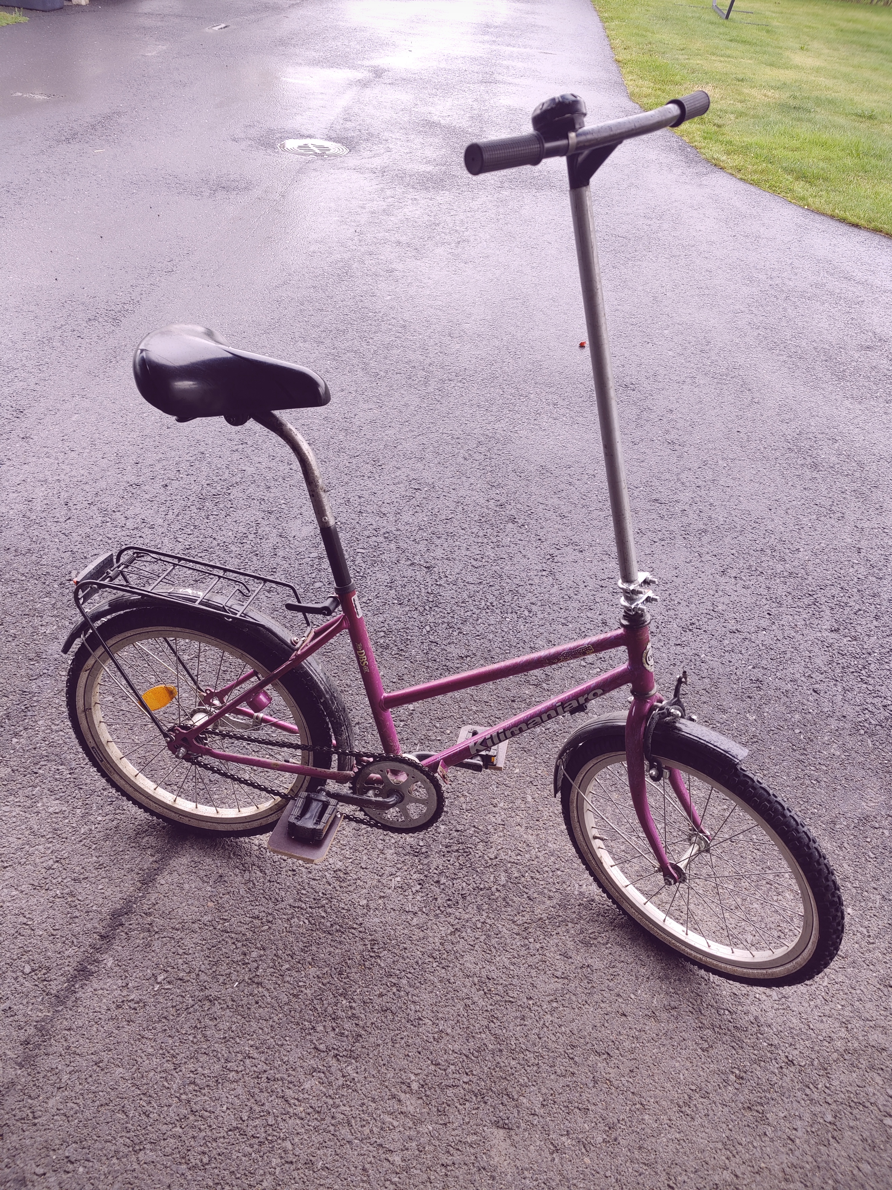 Haarukan ruotoputkeen menee 22,2mm putki sisälle. Vakiostemmistä otin pultin ja kiilan. Niille katlaisin 22,2mm putkesta niin pitkän pätkän kuin pultti ylsi. Toinen pää suoraan ja toinen vinoon. Näin valmistunut putki ruotoputken sisään ja kiristys. Putken ylpään prikan keskitin paikoilleen kiristysvaiheessa lyhyellä 25,4mm putken pätkällä joka sopi sopivan nihkeästi 22,2mm putken päälle. Sitten 25,4mm halkaisijan pitkä putki päälle, alapäähän pikkuhalkio ja pakoputkiklemmarikiristys. Päähän taas vakiostemmi. Pitkä 25,4mm putki oli vähän ohuella seinämällä noin 1,1mm, mutta ei tähän hätään muuta sopivaa ollut.