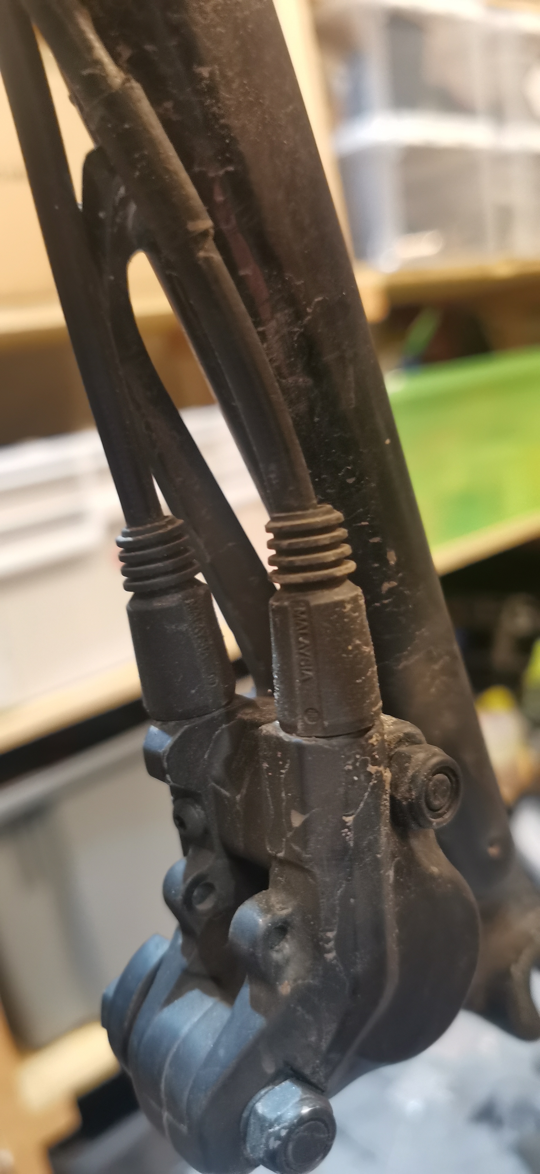 Toisen jarrustulan ilmaus reikään on tehty letku sovite, josta jarru neste menee toiseen satulaan, ilmaus tapahtuu tästä. Yksi jarru kahva käyttää kahta jarrua.