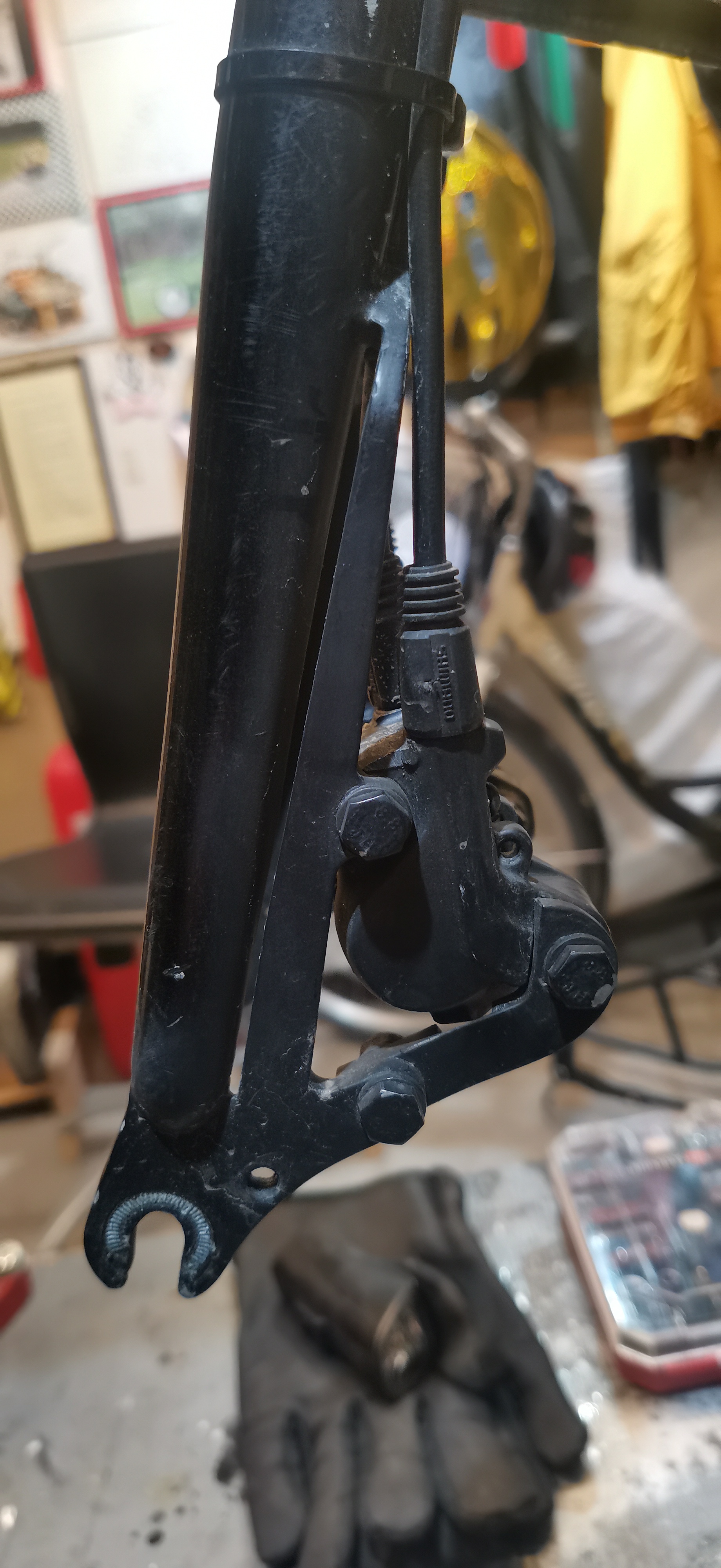 Joten otin pari kuvaa, miten minä olen asian ratkaissut. Minulla on edessä tupla levyt. Jarrusatuloita on hieman "sahailtu". Ne on kiinnitetty suoraan niiden rungosta, ja näin ne on saatu samalle korkeudelle, molemmin puolin.