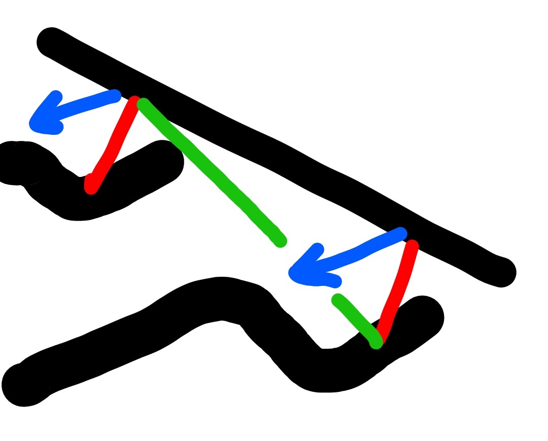 Ymmärsinkö oikein? Punaisella narut/ripustustangot, vihreällä sivutuki ja sinisellä ohjausmekanismi.
