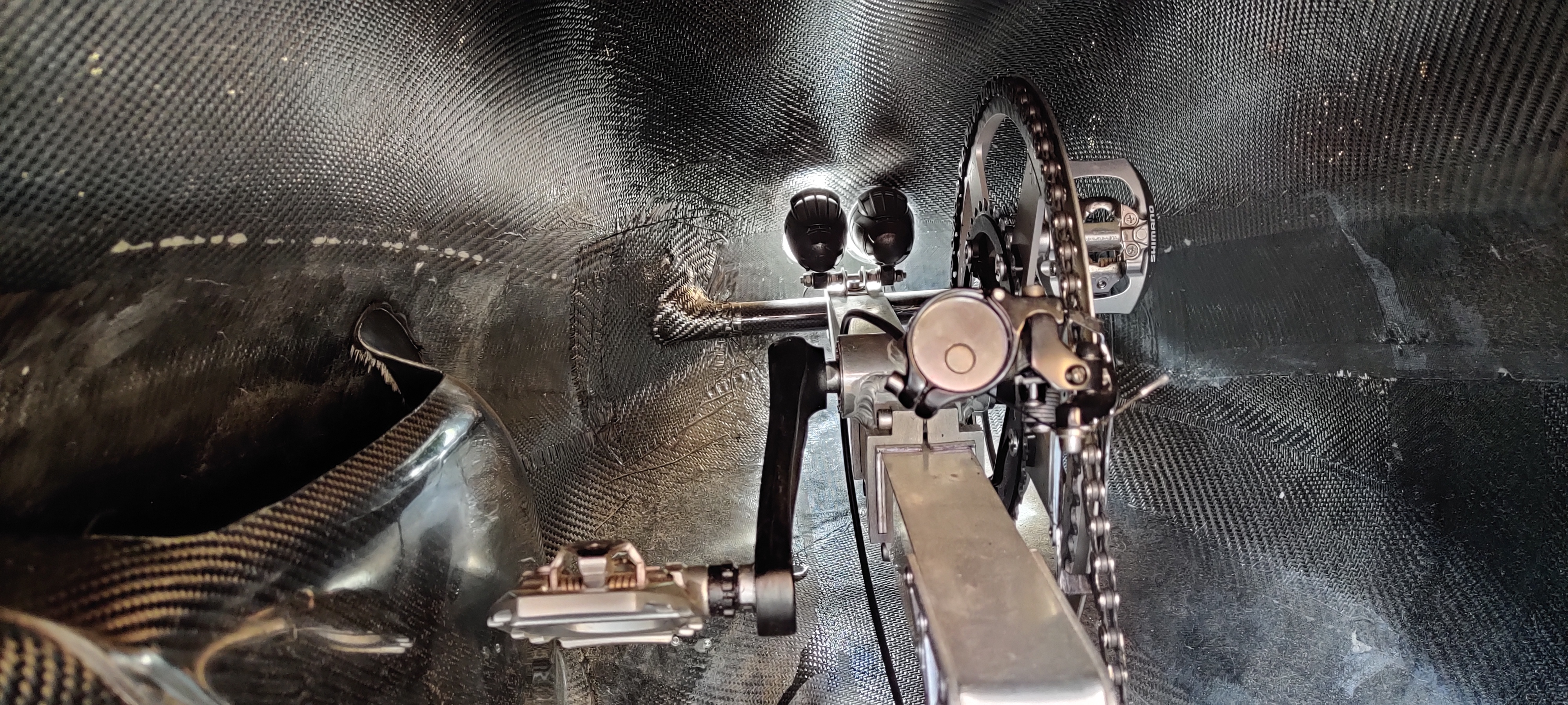 • hiilikuitukuomu, jonka saa jaettua kahteen osaan ja joka mahtuu siten katteiden sisään. Ajaa voi ilman kuomua, puolikuomulla tai sateen pitävällä kokokuomulla.