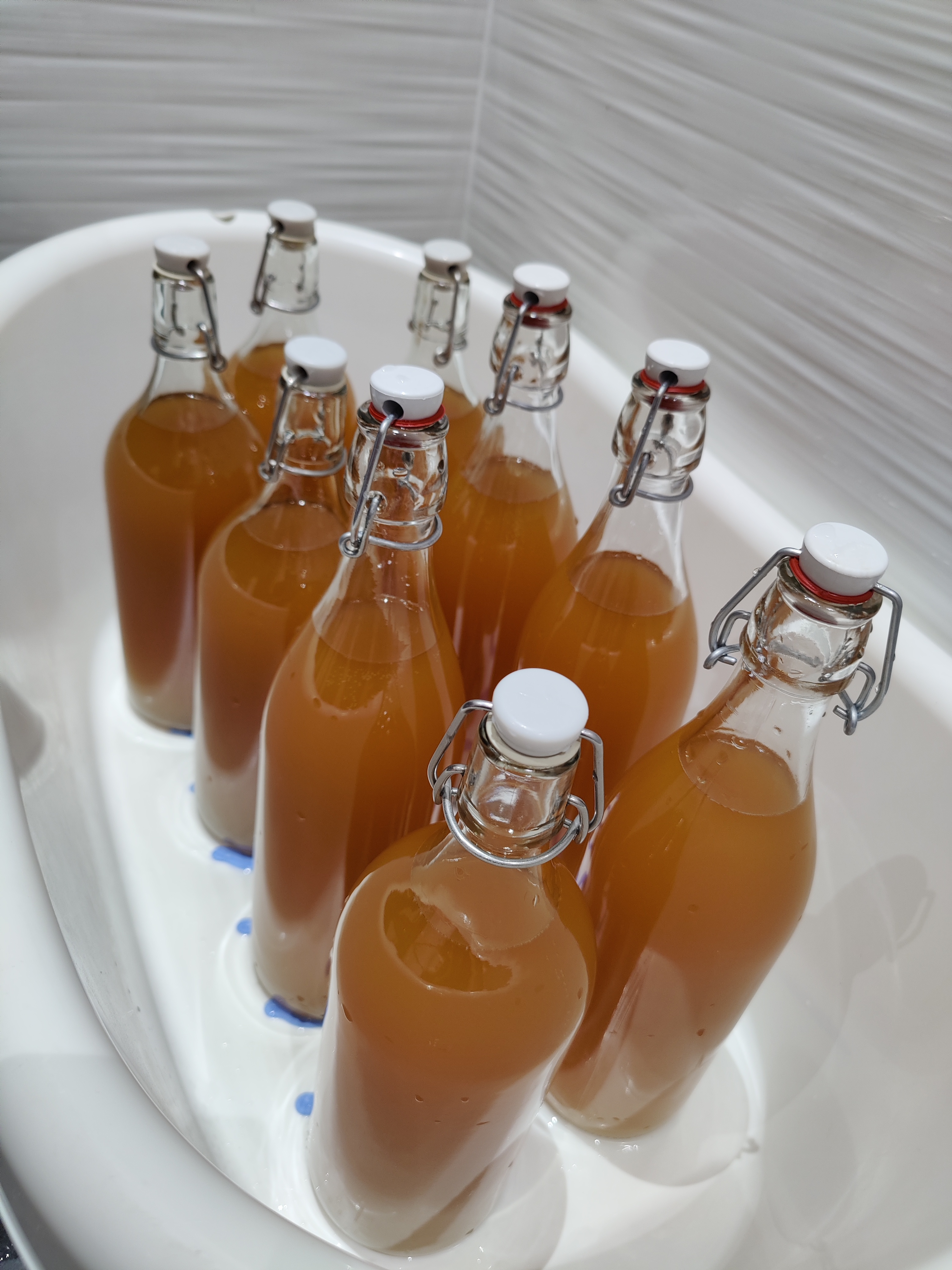 Kokeilin hybridijuomista innostuneena kombuchan ja kotikaljan sekoitusta. Kombucha ei ole pelkästään oikein janojuoma ja kotikaljasta puuttuu vähän ryhtiä. Yhdessä näistä tuli helposti juotava, mutta silti luonteikas juoma.