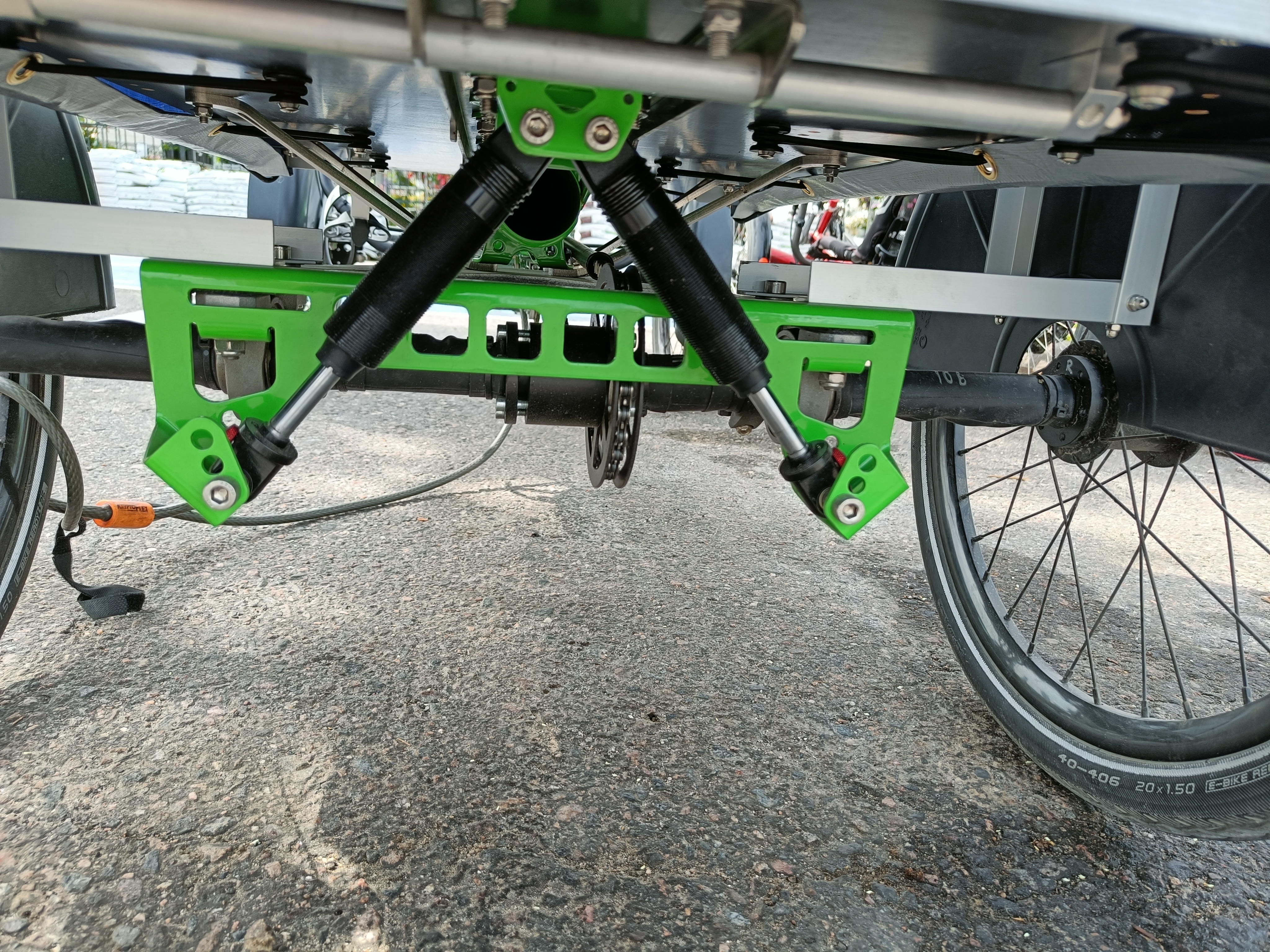 Taka-akseli on erittäin yksinkertainen. Vapaarattaat on sijoitettu takanapoihin jolloin taka-akseli on vain yksi pitkä putki johon on pultattu ratas. Ratasta voi vieläpä siirrellä akselilla siihen kohtaan kun haluaa jolloin ketjulinjasta saa aivan suoran. Kuvissa näkyy myös lehtijousien kiinnitystä joka on vain suoraan pultattuna runkoon. Etupäässä on sitten pallonivelet molemmissa lehtien päissä joka antaa jouston ja ohjauksen tapahtua. Ne on varmasti hieman erikoisemmat osat, mutta muuten rakenne vaikuttaa erittäin fiksulta.