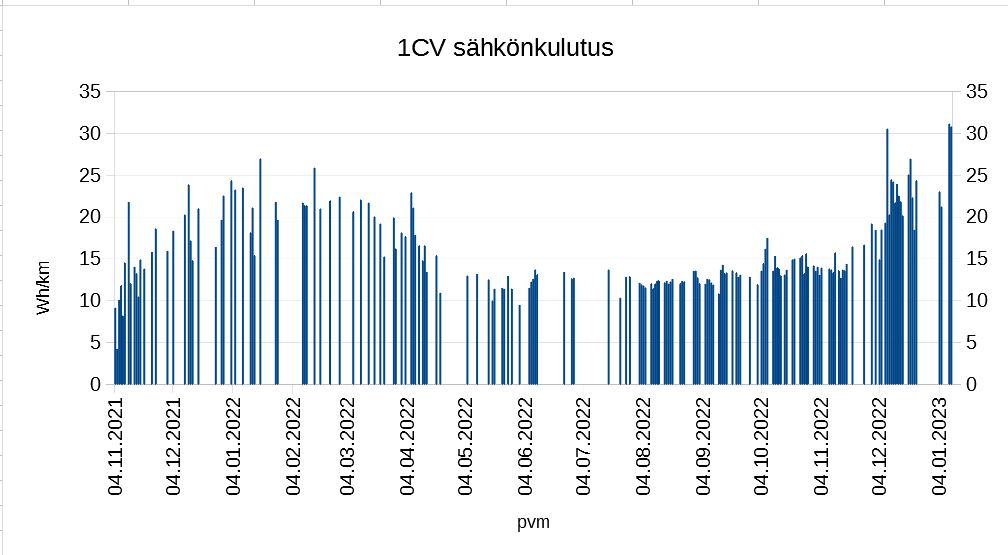 30 Wh/km on sama kuin 3 kWh per 100 km. Autot vievät 17 kWh per 100 km ja niillä ajetaan kovempaa kuin 1CV:llä. Eli kyllä tuo 3 on mielestäni aika suuri lukema, kun ottaa huomioon, miten pikkuinen 1CV on verrattuna oikeisiin sähköautoihin, jotka painavatkin kaksi tonnia. Tosin, onhan autotiet yleensä aurattu paremmin kuin pyörätiet...