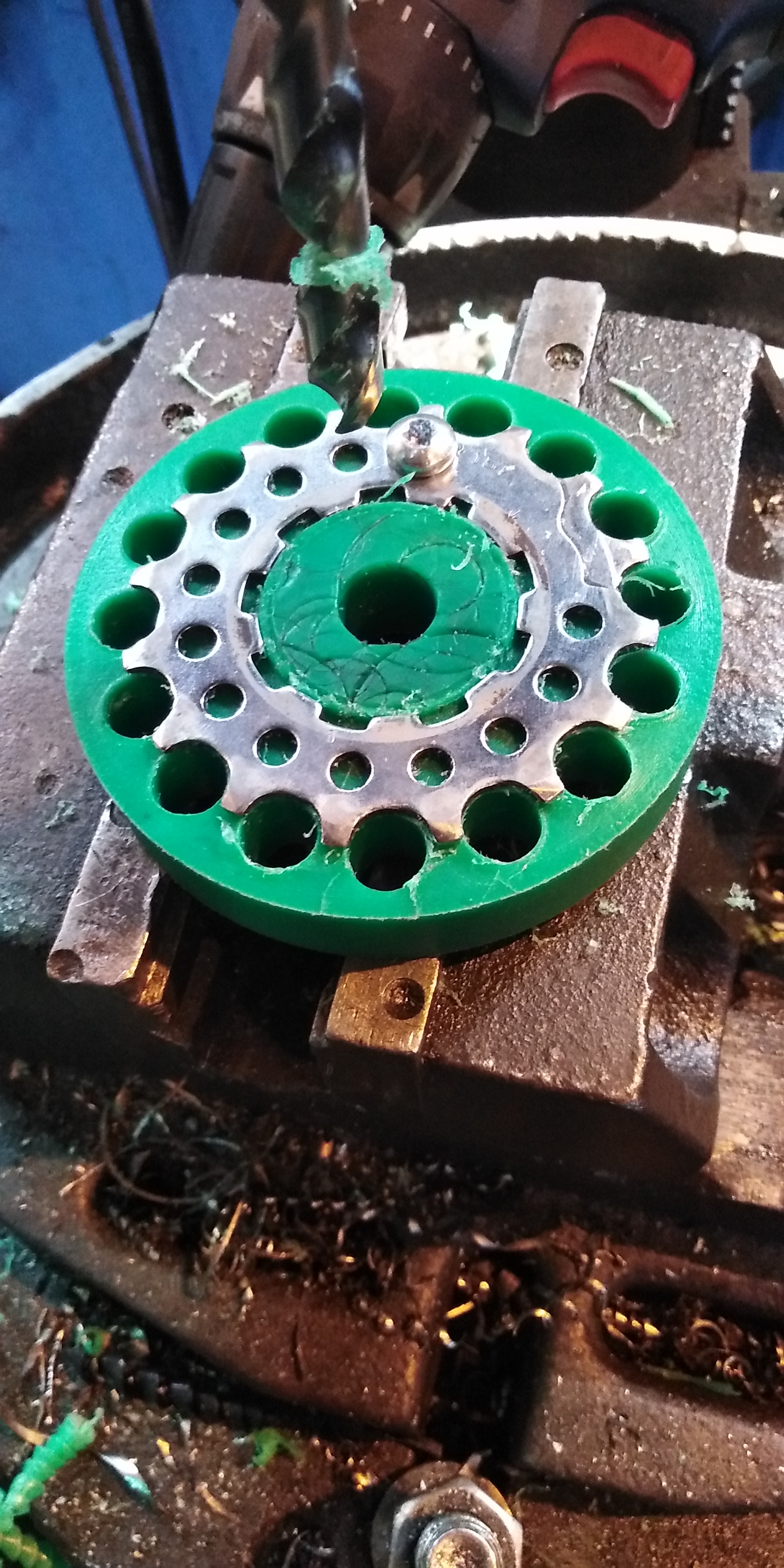 Hammastus rattaan pohjalla. Koneistusjälki ruma kun hankala materiaali ja tylsät teräkselle tarkoitetut terät.