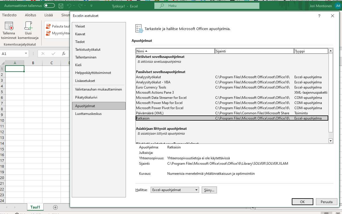 Exceliin tuon Ratkaisimen joutuu ensin asentamaan näiden kuvien mukaisesti.