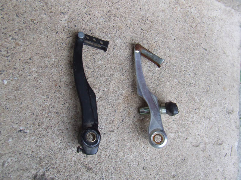 No tuossa on liitteenä kuvia. Ei ollutkaan yhtään Promax länkiä irrallaan, joten niistä kuva pyörässä paikoillaan. Sivukuvista näkee selvästi tukevuuserot jotka on längen kiinnitys- ja jarrupalan kiinnitys pisteiden välissä. Tältä väliltä länget luultavasti joustaa sen verran että palat ei vastaakkaan enään oikein vanteeseen. Näyttää siltä että tuo irrallaan oleva hopean värinen olisi tukevin, mutta siinä on tuo vaijerin kuoren kiinnitys hahlo kaikista ohuin ja siitä olikin tullut se kuoren mutka läpi. Paikoillaan oleva Promax näyttää taas heikoimmalta, se ei ole edes edestäpäin katsottuna paksuin noista.
