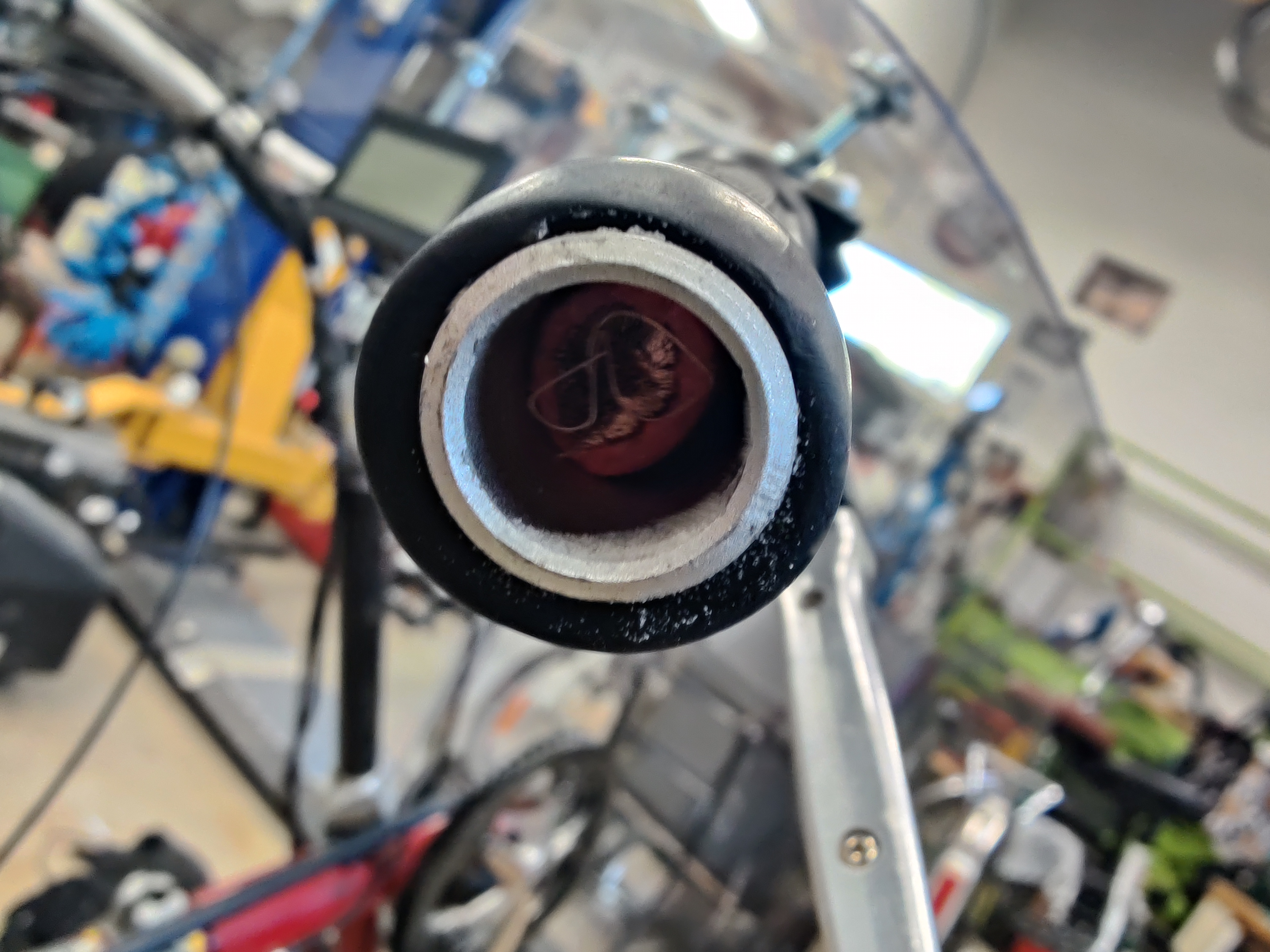 Vähän tuli turhan etupainoinen ohjauksesta tuon katteen kanssa. Mietin miten sitä kompensoisin ja silmään sattui johtolaatikosta pilkistävä noin metrinen 70mm2 hitsauskaapelin pätkä. Voitelin sen silikonisprayllä ja pukkasin ohjaustangon sisään. Vaaksan verran lyhensin, niin yltää tangon päästä päähän. Koeajo jää huomiselle, kun sataa vettä ja on pimeää.