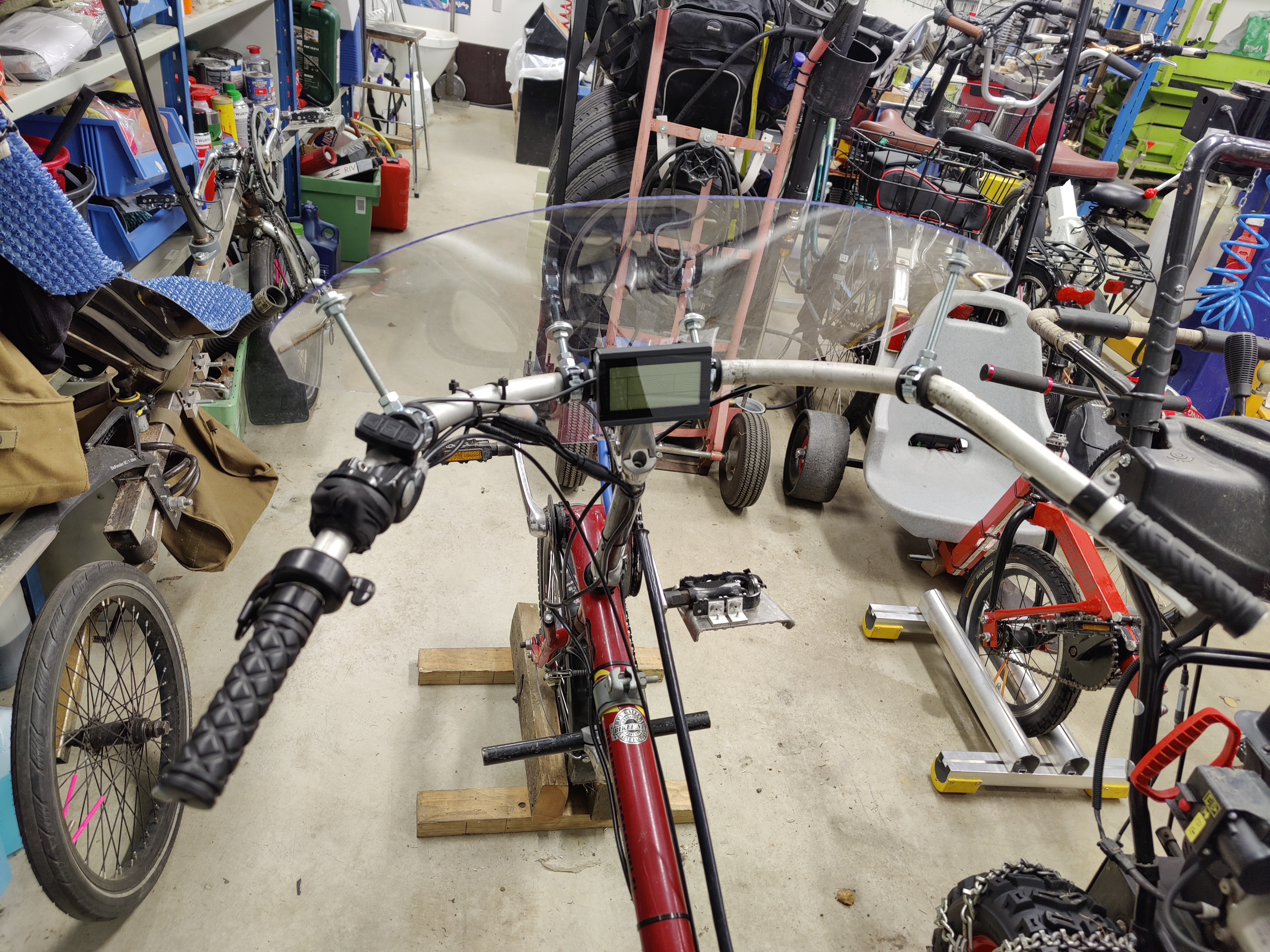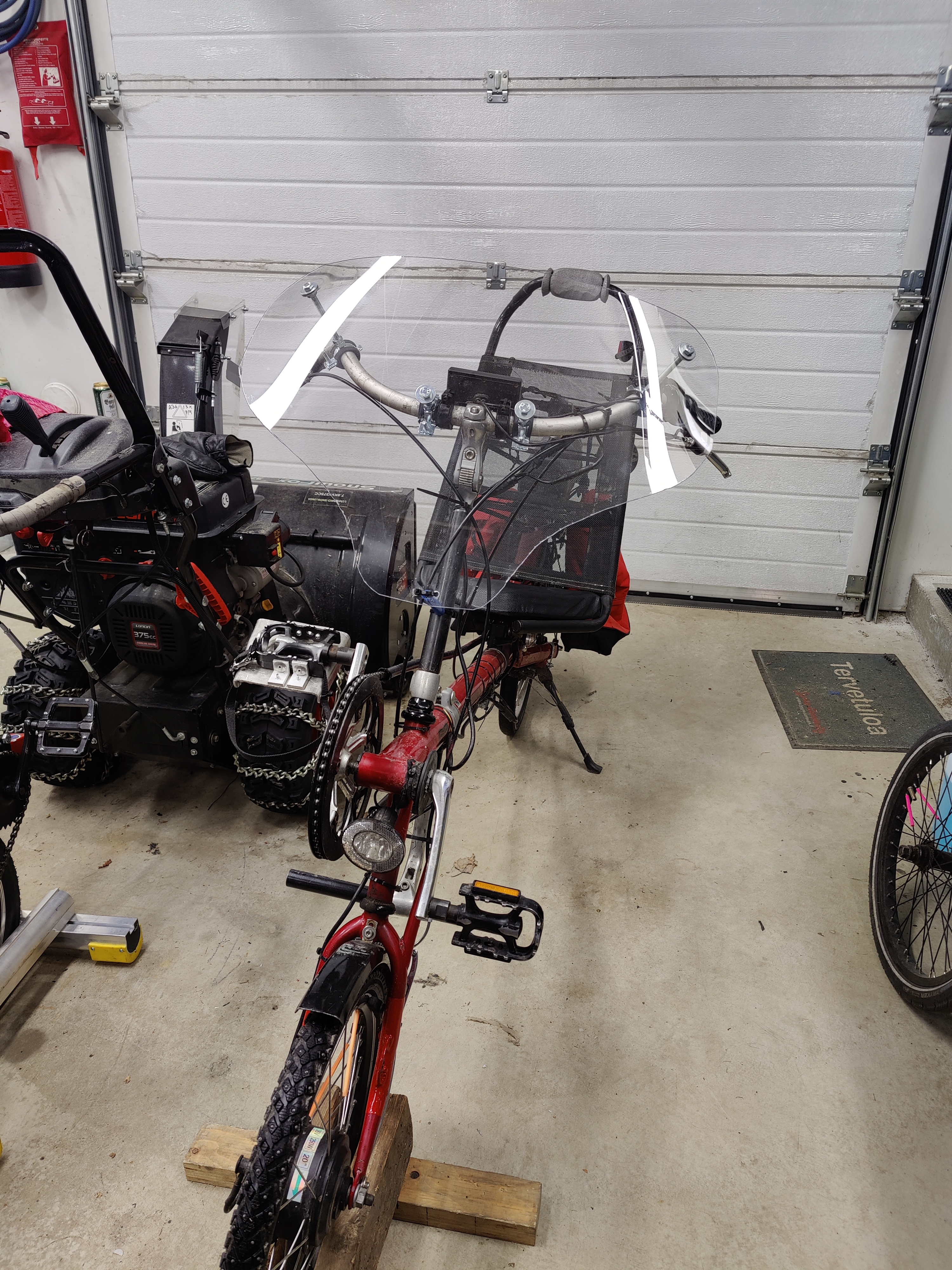 No jopa rauhoittui ohjaus hitsauskaapelilla. Tuli mieleen Harley Davidson ajokokemus. Rautamöykky, minkä ohjausta ei ihan pienet nakkele. Kävin myös soralla ja nurmikolla kokeilemassa, niin ohjauksen hitausmomentti yhdistettynä karkeaan renkaaseen esti aiemmat eturenkaan luiruamiset kokonaan. Aivan perhanan huonosti rullaa tämä nastarengas.
