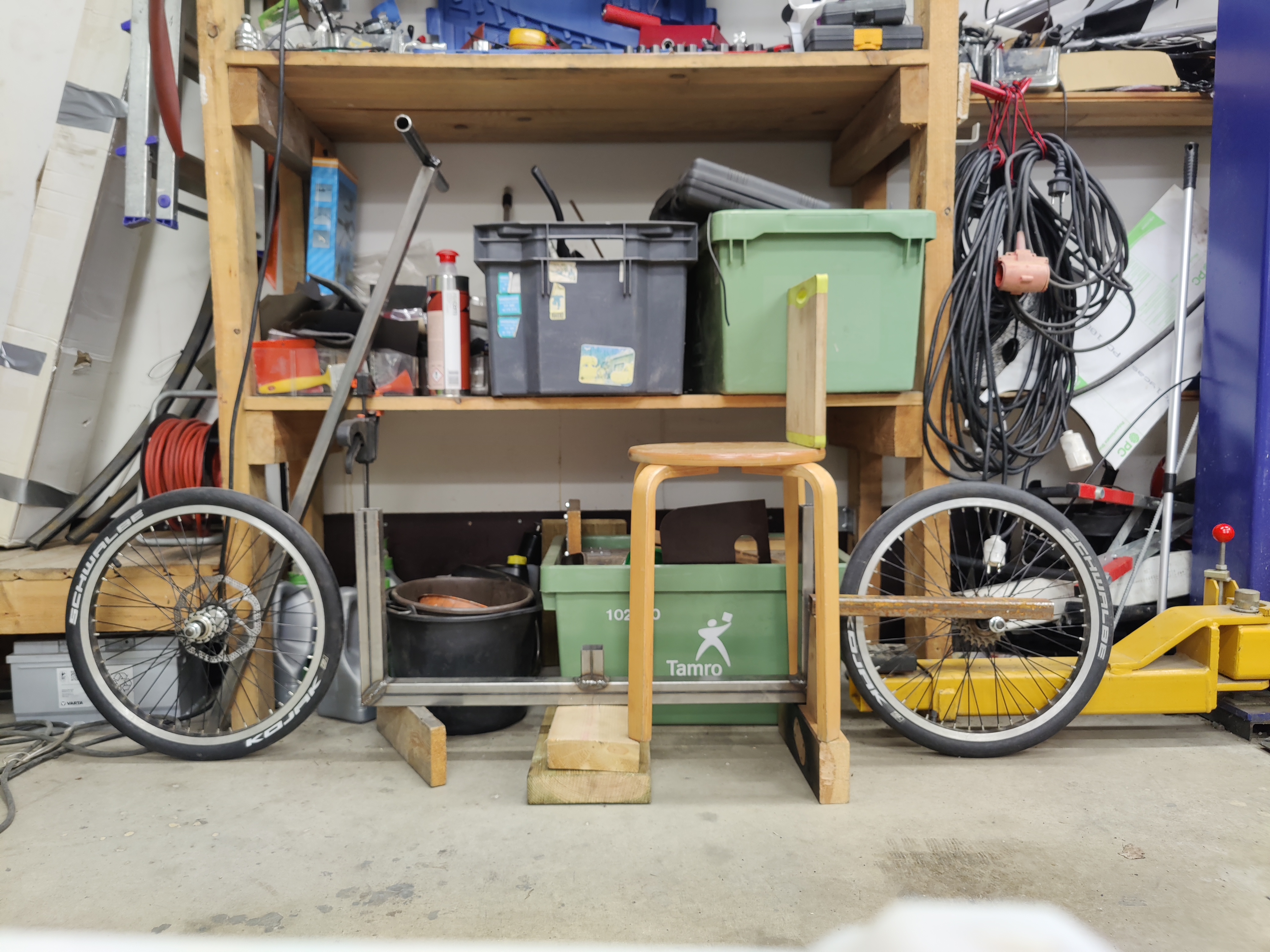 Tuollaisen vois tehdä lähikauppa asiointiin ja asuntovaunun pyörätelineelle. Matala jalannostokorkeus ja muutenkin helppo lyhyen matkan kulkine.